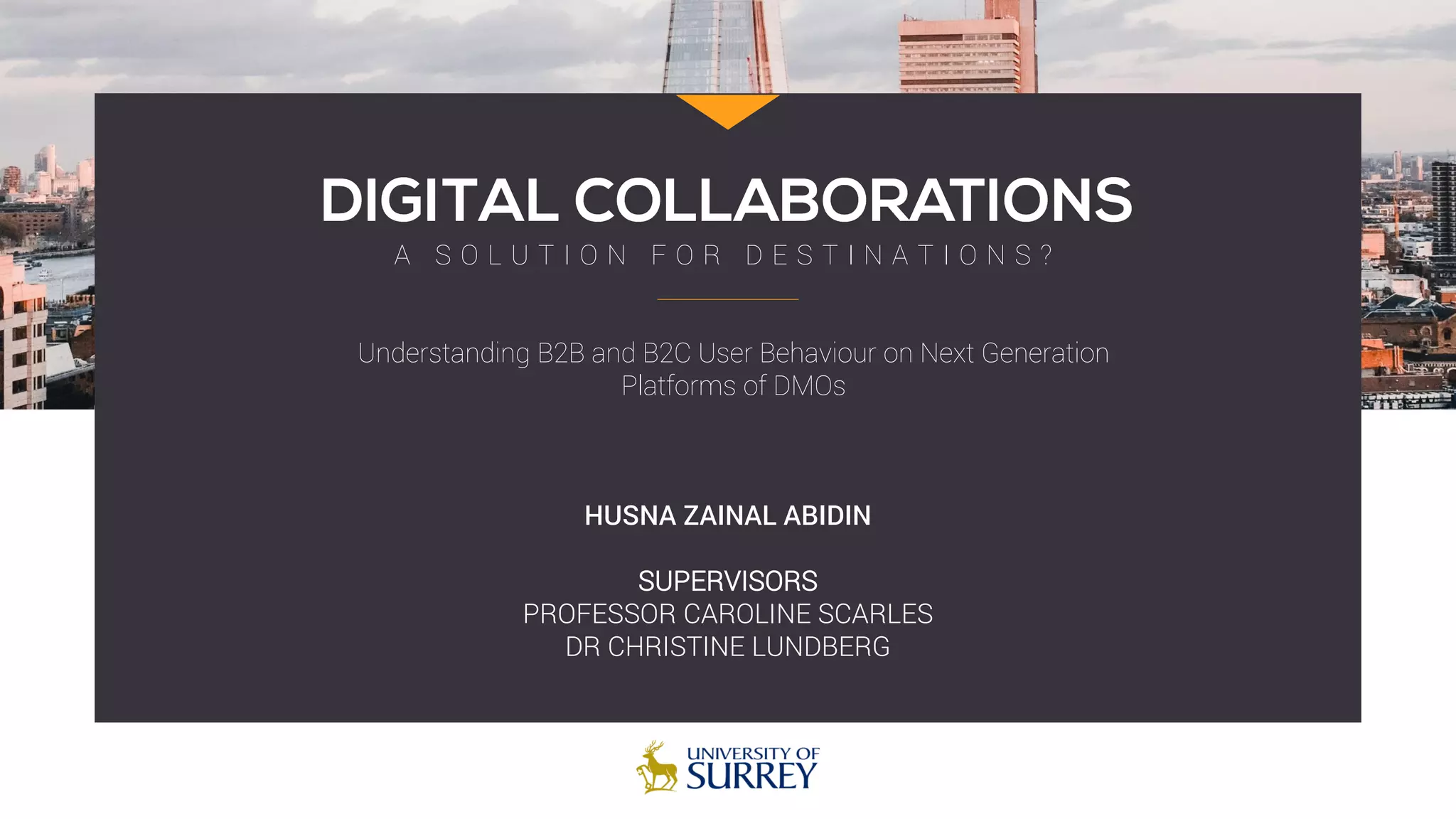 The document discusses the role of digital platforms and collaboration in tourism and destination management. It notes that digital platforms can enable asset and information sharing between businesses, but that Destination Management Organizations (DMOs) need to improve their online presence and support for local businesses. The document also profiles different stakeholders in tourism, including businesses that want guidance, networking and knowledge sharing through a DMO's digital platform, and visitors who struggle with information overload on websites. It concludes by stating the research aims to provide a framework for a digital platform that can drive the local economy and build community.