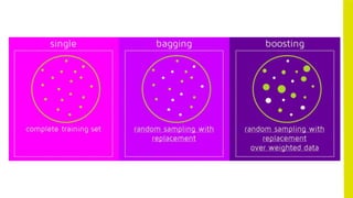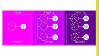 The document discusses supervised learning techniques, focusing on ensemble methods like bagging and boosting that combine weak learners to improve performance. Bagging reduces variance by generating multiple datasets and creating diverse models, while boosting sequentially enhances accuracy by reducing bias through a cost-based model combination. Additionally, it analyzes feature importance and accuracy evaluation for algorithms like XGBoost and Random Forest, highlighting differences in handling correlated features and model performance metrics.
