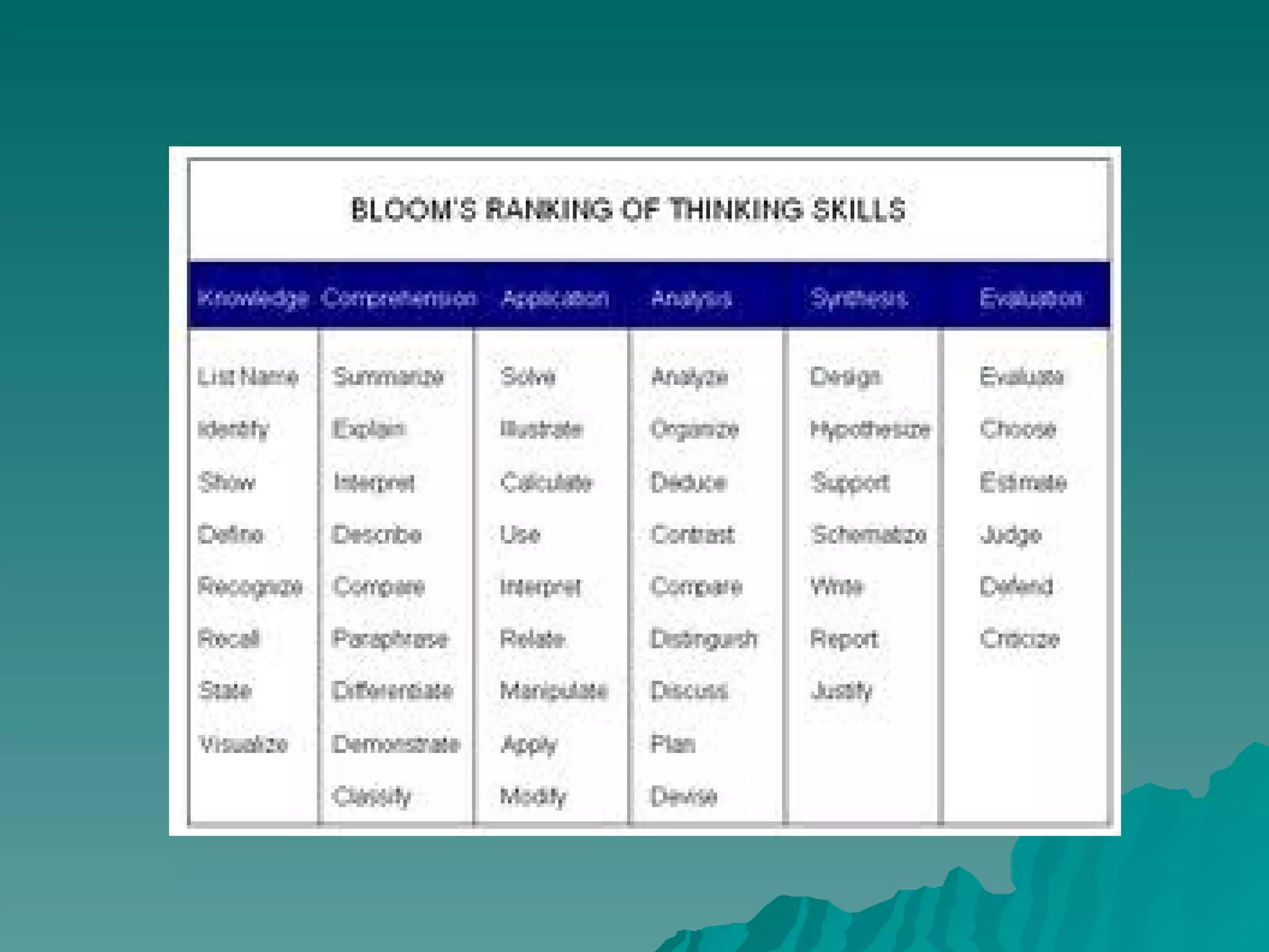 This document provides an overview of Bloom's Taxonomy, a classification of levels of thinking skills. It discusses the six main cognitive levels - Remembering, Understanding, Applying, Analyzing, Evaluating, and Creating. For each level, it lists thinking verbs associated with that level and provides potential classroom roles and activities. It also provides examples of questions teachers could ask students to target each of the different cognitive levels.