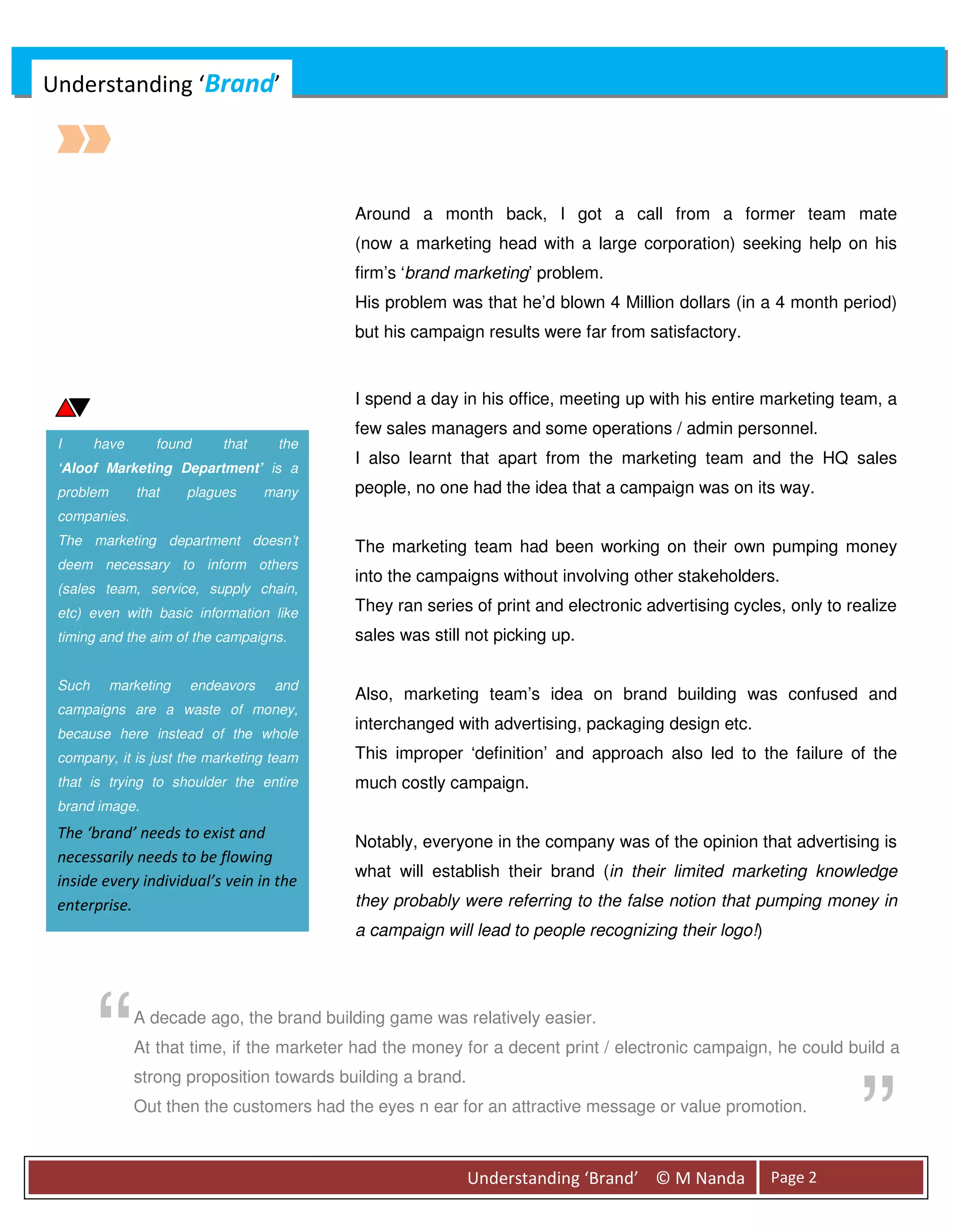 The document discusses the importance of building a brand through a holistic approach that involves all stakeholders within a company. It provides examples of how marketing departments often fail by focusing only on advertising without coordinating with other departments. A successful brand is built through consistent communication of core values across the entire customer experience, from product to sales and service. Marketers must understand customers thoroughly to position the brand in a way that meets their needs and builds emotional attachment to the brand over time.