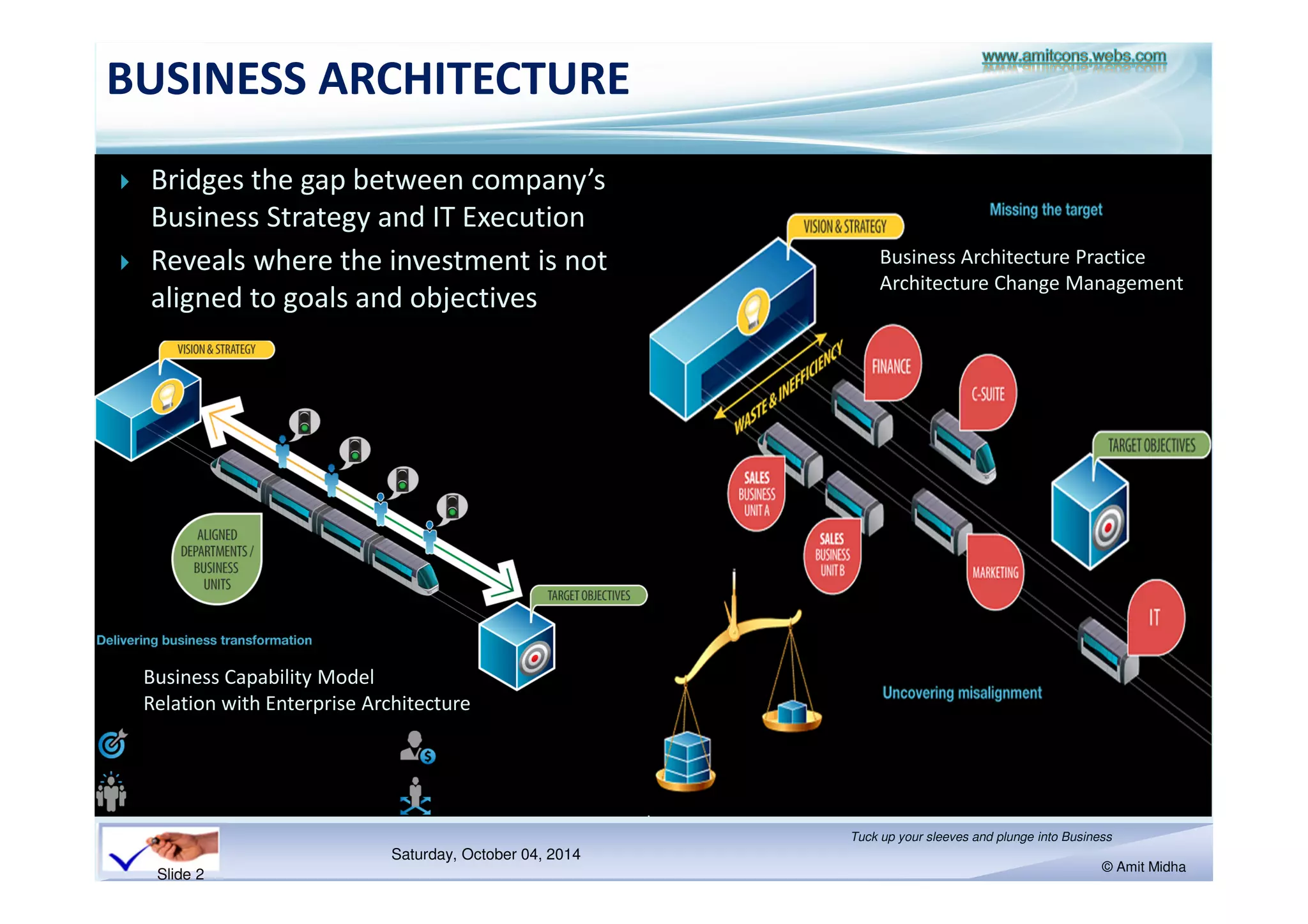 The document discusses a presentation about business architecture. It defines business architecture as bridging the gap between business strategy and IT execution. It also reveals misalignments between investments and goals. The presentation covers topics like business capability modeling, enterprise architecture frameworks, and relating business architecture to domain and technology architecture. It aims to help attendees understand business architecture and how it aligns the role of a business architect with other roles in an organization.