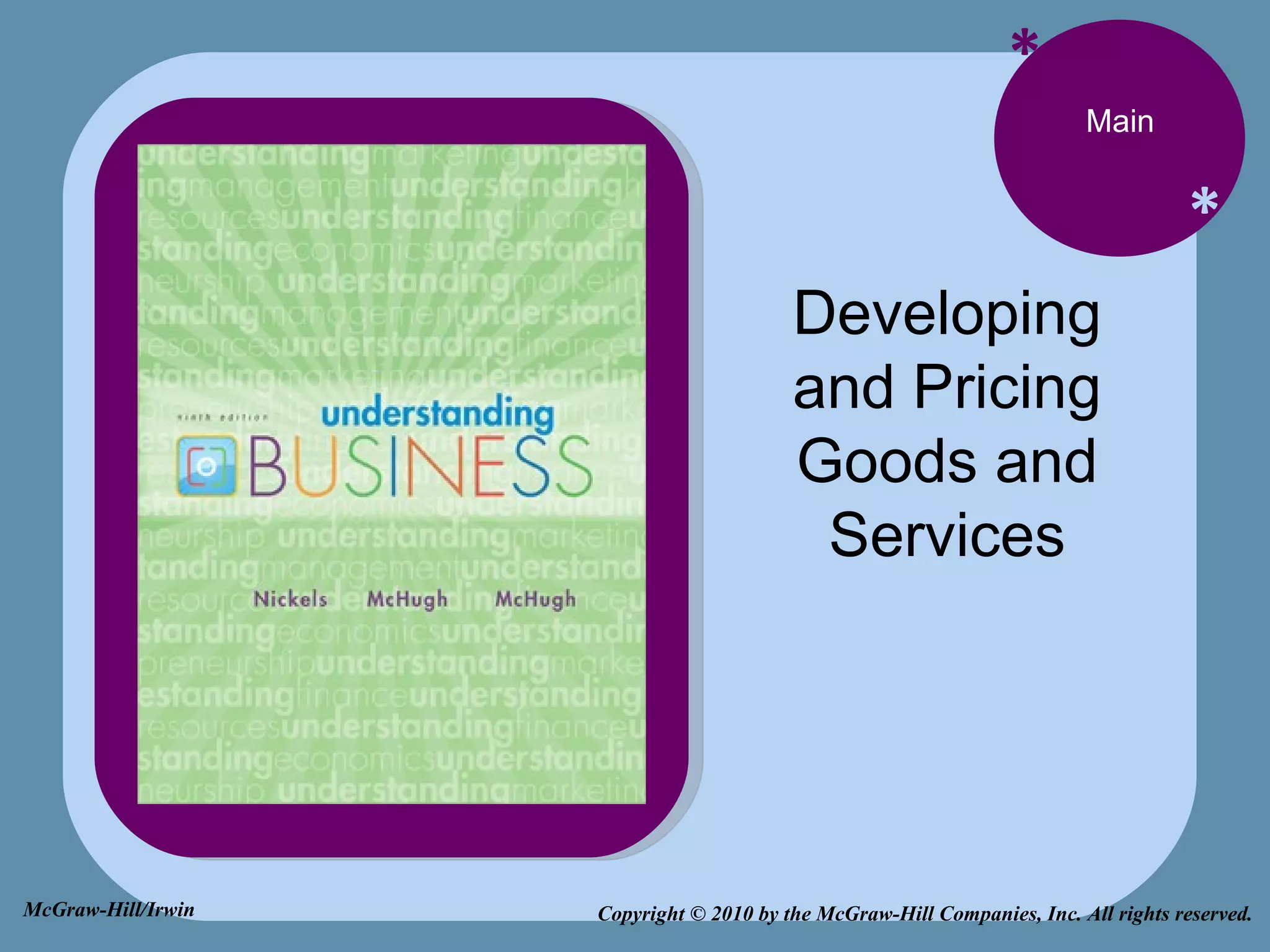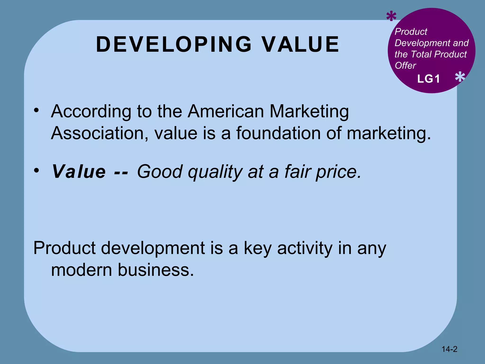The document discusses various topics related to product development and pricing, including: