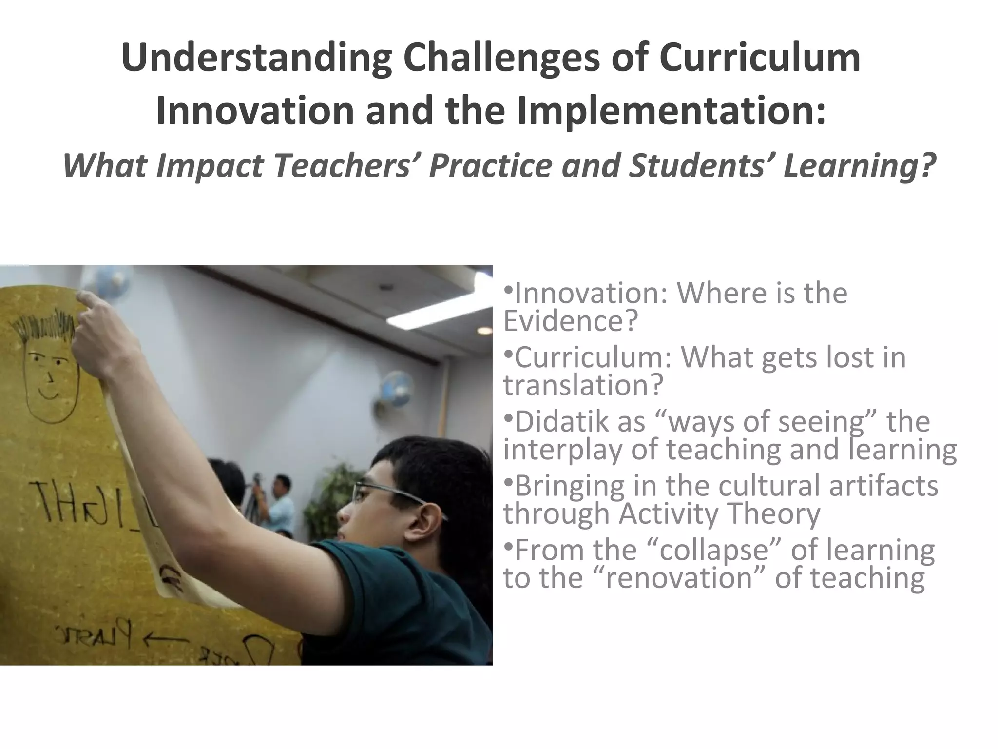 The document discusses the challenges of curriculum innovation and its implementation in education, emphasizing the impact on teaching practices and student learning. Key themes include the evidence of effective innovation, the loss of meaning in curriculum translation, and the interplay between teaching and learning shaped by socio-political contexts. It also addresses the need for collaboration among teachers and the importance of adapting educational practices to meet diverse student needs while managing reform fatigue.