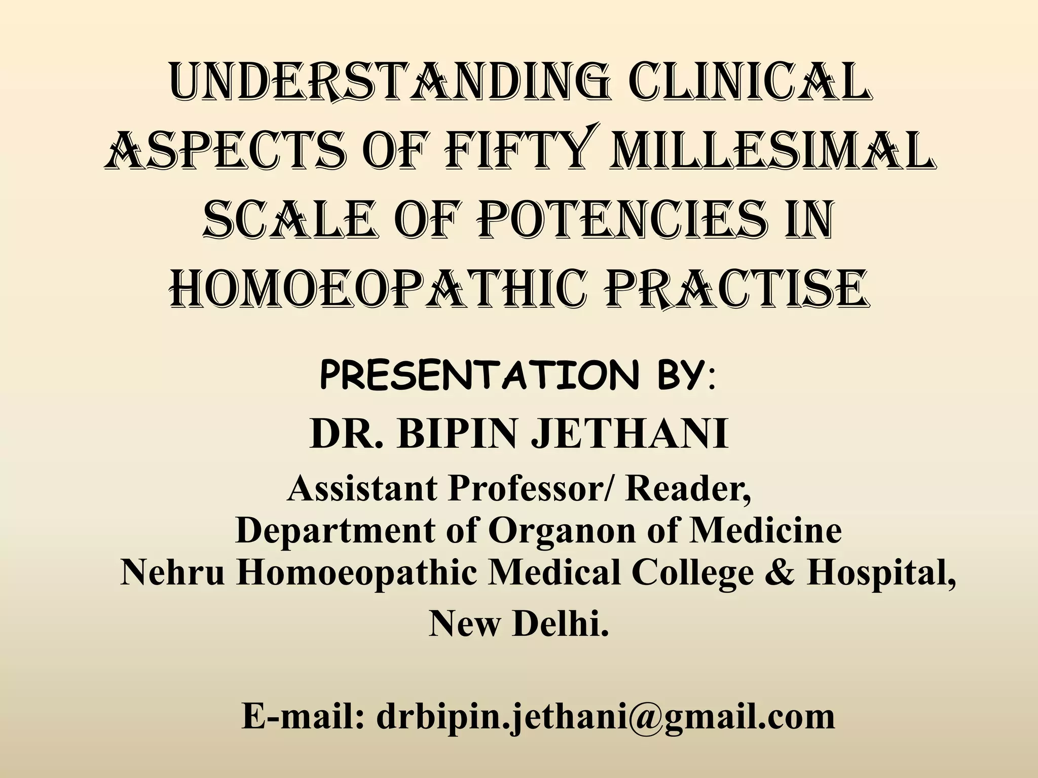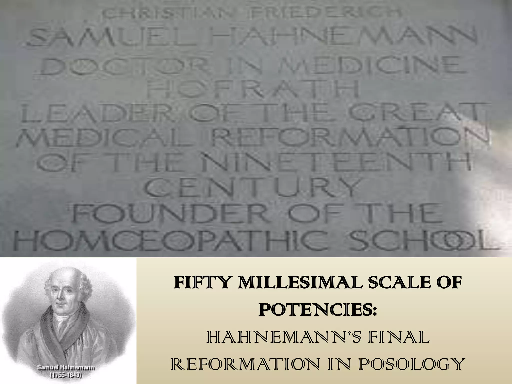 This document summarizes Dr. Bipin Jethani's presentation on the 50 millesimal scale of potencies in homeopathic practice. It discusses how Hahnemann transformed the centesimal scale of potencies by recommending administration of the simillimum in liquid form and changing the degree of dynamization with each dose. This led to the development of the 50 millesimal scale, which offers advantages like milder action, freedom from aggravations, and more rapid return to health. The document outlines Hahnemann's correspondence where he shared his new discovery of the 50M scale with Baron von Boenninghausen before his death.