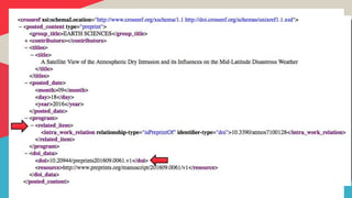 The document elaborates on the various components of metadata utilized by CrossRef, including basic bibliographic references, abstracts, and linked clinical trials, which collectively enhance discoverability and research facilitation. It outlines the optional features like CrossMark and licensing, which contribute to enriching metadata and enabling better user experiences. Additionally, it touches upon the importance of crawler support and text & data mining resources for accessing content effectively.