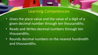 This document provides instruction on decimals, including place value, reading and writing decimals, and rounding decimals. It includes examples of naming place values and values of digits in decimals, writing decimals in words, and rounding decimals to different places. Students are assigned pages in their math module to complete activities on decimals and a performance task that involves entering a code on a website.