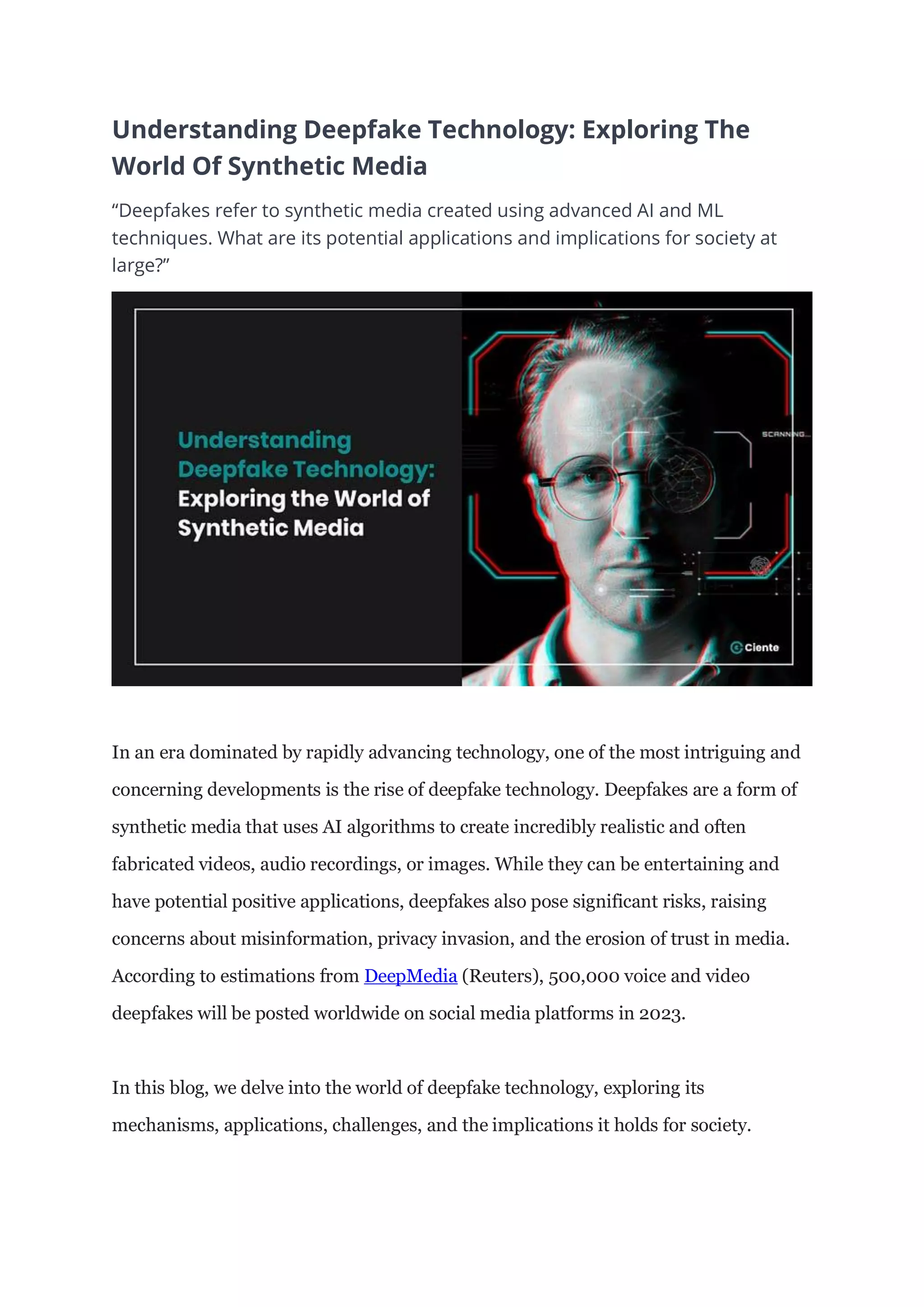 Deepfake technology utilizes AI algorithms to create realistic synthetic media, with potential applications in entertainment, dubbing, and personalized content. However, it raises significant concerns regarding misinformation, privacy invasion, cybersecurity threats, and the erosion of trust in media. Addressing the challenges posed by deepfakes will require a multifaceted approach, including the development of detection tools, promoting media literacy, and fostering collaboration among stakeholders.