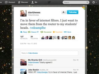 - The importance of teaching netiquette, activism, information literacy, and respecting rights of creators and consumers in digital spaces.