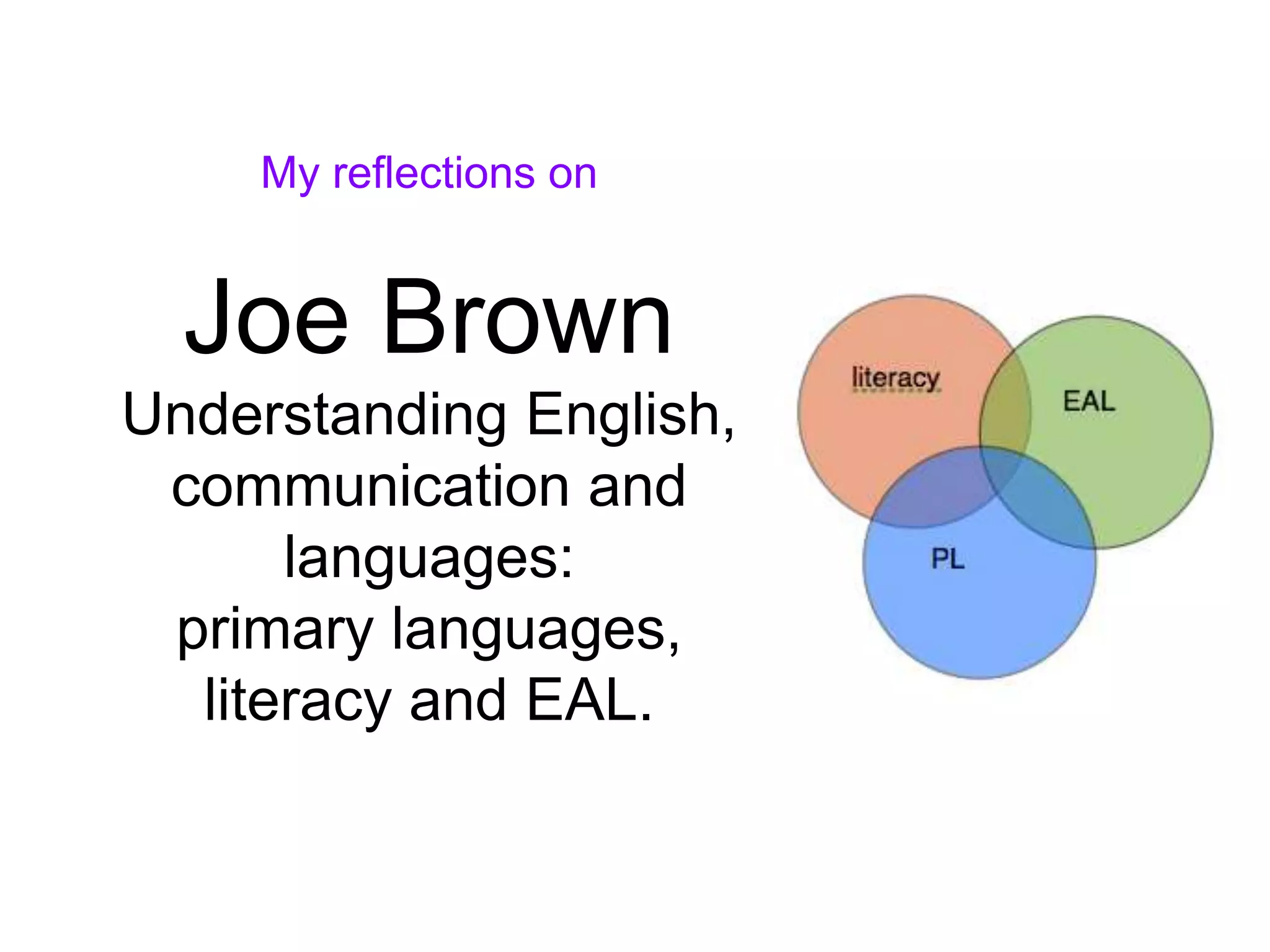 This document discusses Joe Brown's reflections on understanding English, communication, and languages including primary languages, literacy, and students learning English as an additional language.