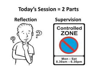 Today's session involves two parts: reflection and supervision. The session will provide an opportunity to reflect on a case study and various theories about groups, change, self-awareness, approaches to counseling, and reflection and supervision. Participants will be asked to make connections between the case study, counseling theories, and prior learning from last semester.
