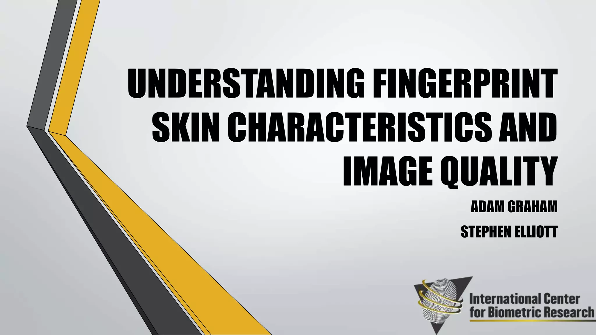 This document summarizes research examining the relationship between fingerprint skin characteristics (moisture, oiliness, elasticity, temperature) and image quality. Three datasets were collected from participants using different fingerprint sensors and skin analysis devices. Correlation analyses were conducted to determine relationships between the skin characteristics and image quality, as well as between characteristics. Preliminary results found slight correlations between some characteristics and quality, but inconsistencies between datasets. The research aims to determine if collecting skin data improves image quality.
