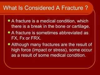 A fracture is a break in the bone. There are several factors that can influence fractures, such as age, disease, and location of the break. There are different types of fractures including simple (closed break in the bone), compound (open break where the bone pierces the skin), complete (bone broken into two or more pieces), and incomplete (bone is cracked but not completely broken). Specific types of fractures include comminuted (bone shattered into fragments), impacted (broken bones jammed together), and pathologic (caused by weakened bones from disease like osteoporosis).