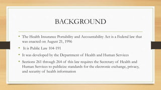 The document provides an overview of HIPAA guidelines for new employees at a medical facility. It explains that HIPAA is a federal law that protects patients' private health information. It establishes standards for authorized access, use and disclosure of protected health information. The summary outlines key aspects of HIPAA like patient authorization required before releasing any health records, limiting use of information to minimum necessary, and imposing security measures like password protection, encryption, and logging of computer access. Employees must complete training on HIPAA policies to ensure strict privacy, confidentiality and security of patient data.