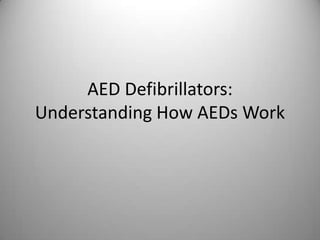 An AED (automated external defibrillator) delivers an electric shock to reset an abnormal heart rhythm when needed. Modern AEDs have pads attached to the chest to monitor the heart and deliver shocks if a "shockable" rhythm like ventricular fibrillation is detected, unlike depictions of paddles used on flatlined patients. Popular AED models like the Zoll AED Plus and Philips HeartStart provide audio and visual instructions to guide rescuers through defibrillation and CPR if required.