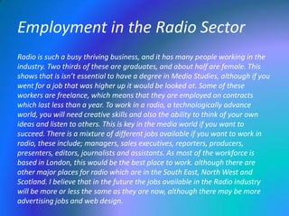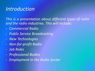 This document provides an overview of different types of radio industries in the UK, including commercial radio, public service broadcasting, new technologies, and non-profit radio. It discusses major commercial radio stations like Capital FM and Radio Aire. It also outlines various job roles in the radio sector, including managers, sales executives, reporters, producers, and presenters. Employment in the radio industry involves around two-thirds graduates and is centered mainly in London, the Southeast, Northwest, and Scotland.