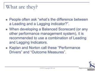 The document explains the distinction between leading and lagging indicators in performance management, emphasizing their complementary roles in achieving strategic goals. Leading indicators allow for proactive adjustments while lagging indicators confirm outcomes, with both types present in a balanced scorecard framework. It concludes that effective metrics should align with organizational objectives to track performance accurately.