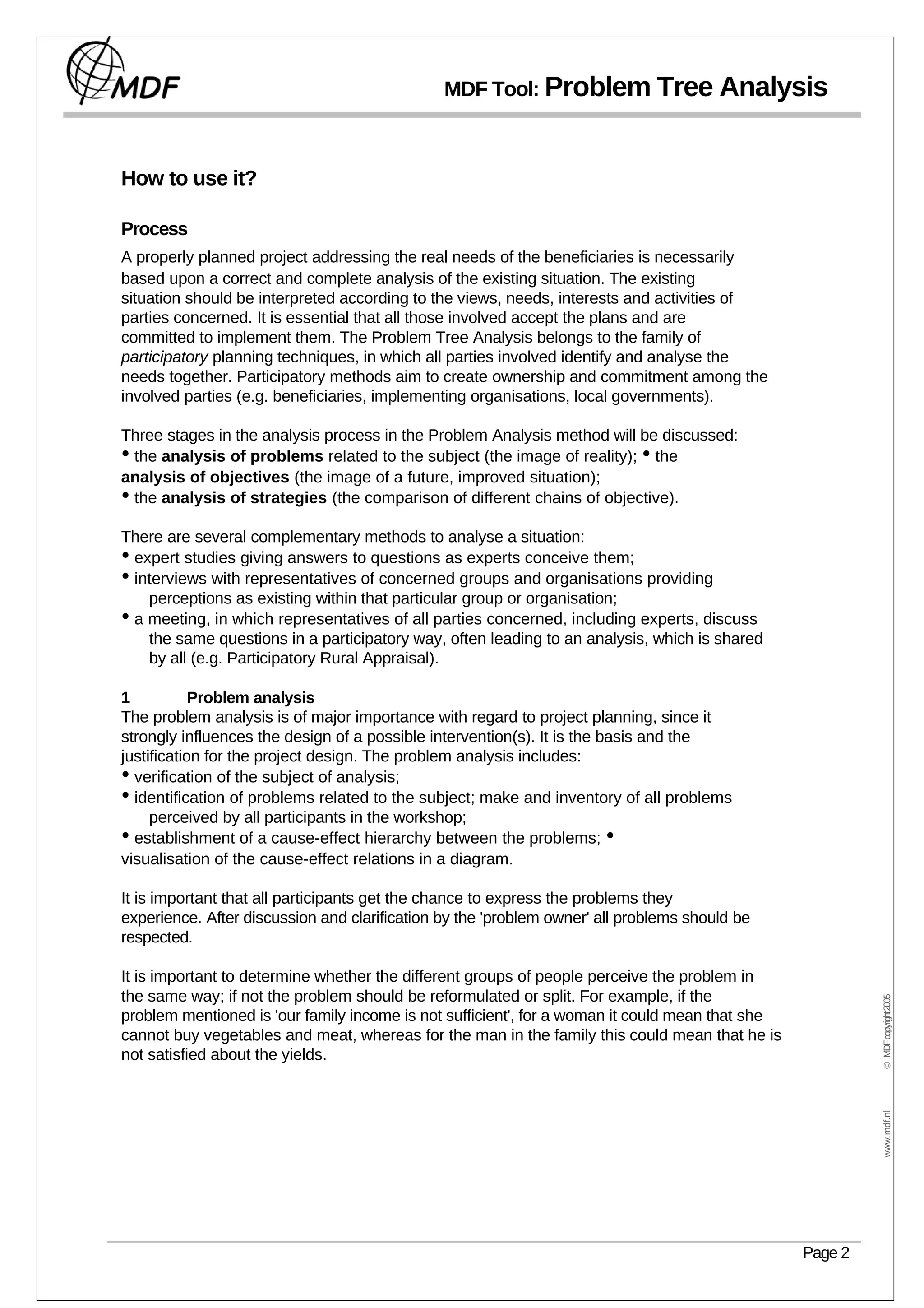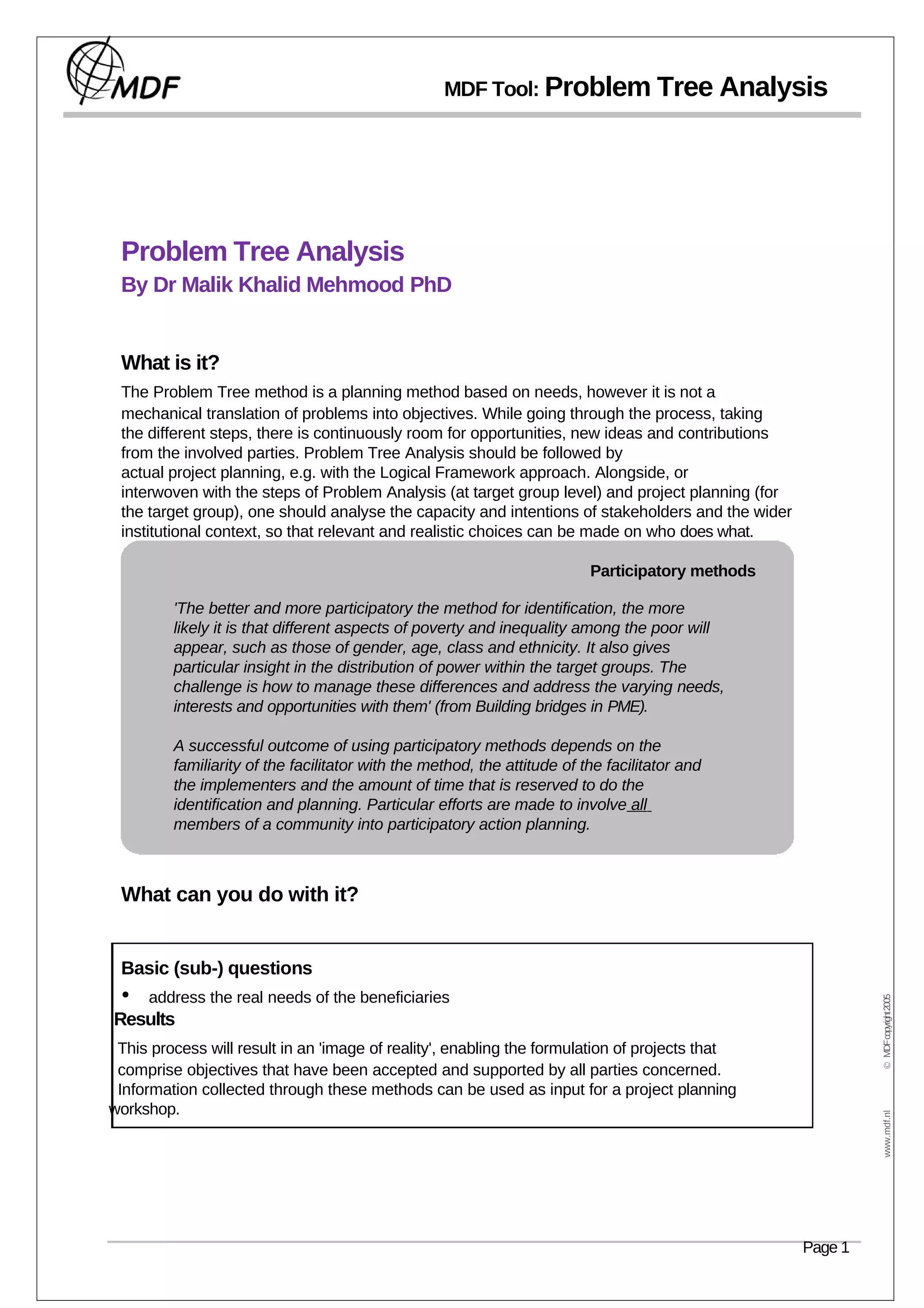 This document describes the Problem Tree Analysis method for project planning. It involves 3 stages: [1] analyzing problems through stakeholder participation to create a "problem tree" diagram; [2] translating problems into objectives to create an "objective tree"; [3] analyzing strategies by clustering objectives and selecting a scope. The method results in a shared understanding of the situation to inform project design that has stakeholder commitment and addresses real needs.