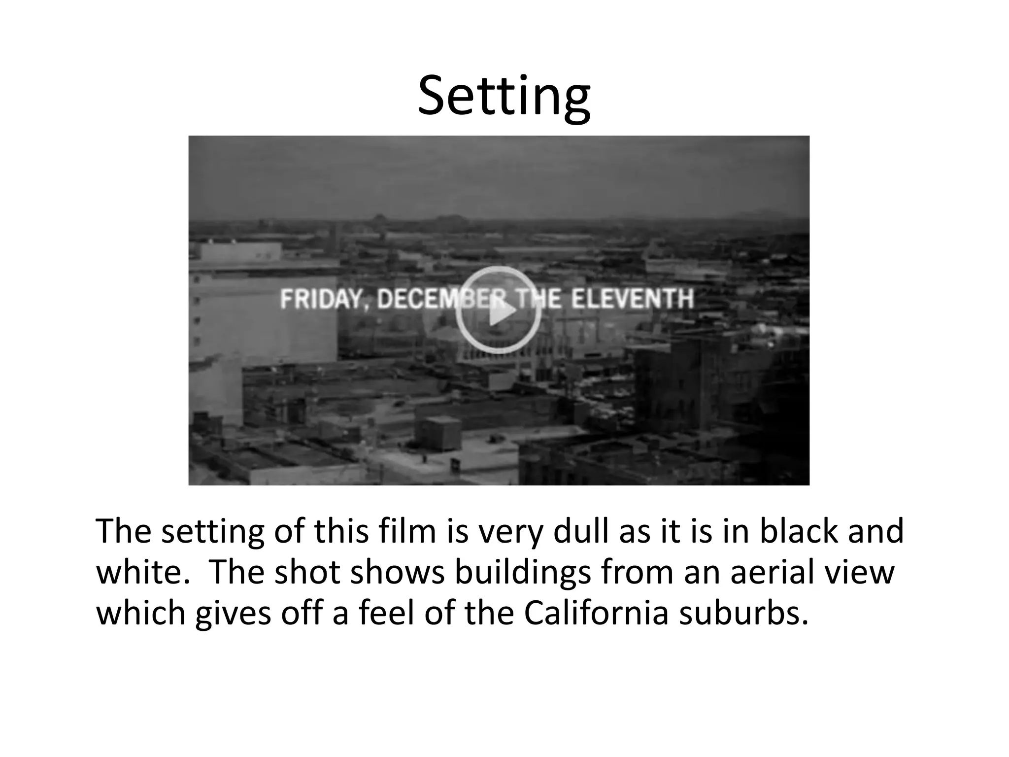 This document analyzes the micro elements used in the opening scene of the film "Psycho". It discusses the black and white aerial setting showing California suburbs. Props like a jug and cups are used to emphasize what the male character is doing for the female. Costumes are portrayed as very sexual with minimal clothing showing a close relationship. Shots include a lady looking up at a man talking, a close up showing intimacy, a medium shot capturing the situation, a long shot showing where she will enter, and a pan shot of the environment. Cuts are used to show the characters talking and being intimate. The pace is very fast with many cuts in a short time making the meaning more effective. Physical expressions, vocal delivery