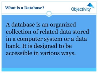 Object oriented databases store data as objects rather than as basic data types. They evolved from relational databases with the development of object-oriented programming languages in the 1980s. OODBMS allow objects to be stored in databases and support the basic CRUD operations on objects. Some advantages of OODBMS over relational databases include an intuitive object data model, extensibility through inheritance, and tighter coupling between applications and data.