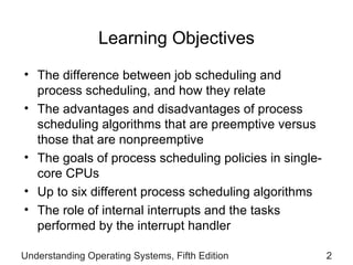 The document discusses processor management and process scheduling in operating systems. It describes the difference between job scheduling and process scheduling, and covers six common process scheduling algorithms: first-come, first-served, shortest job next, priority scheduling, shortest remaining time, round robin, and multiple-level queues. It also discusses process states, process control blocks, and the role of interrupts in processor management.