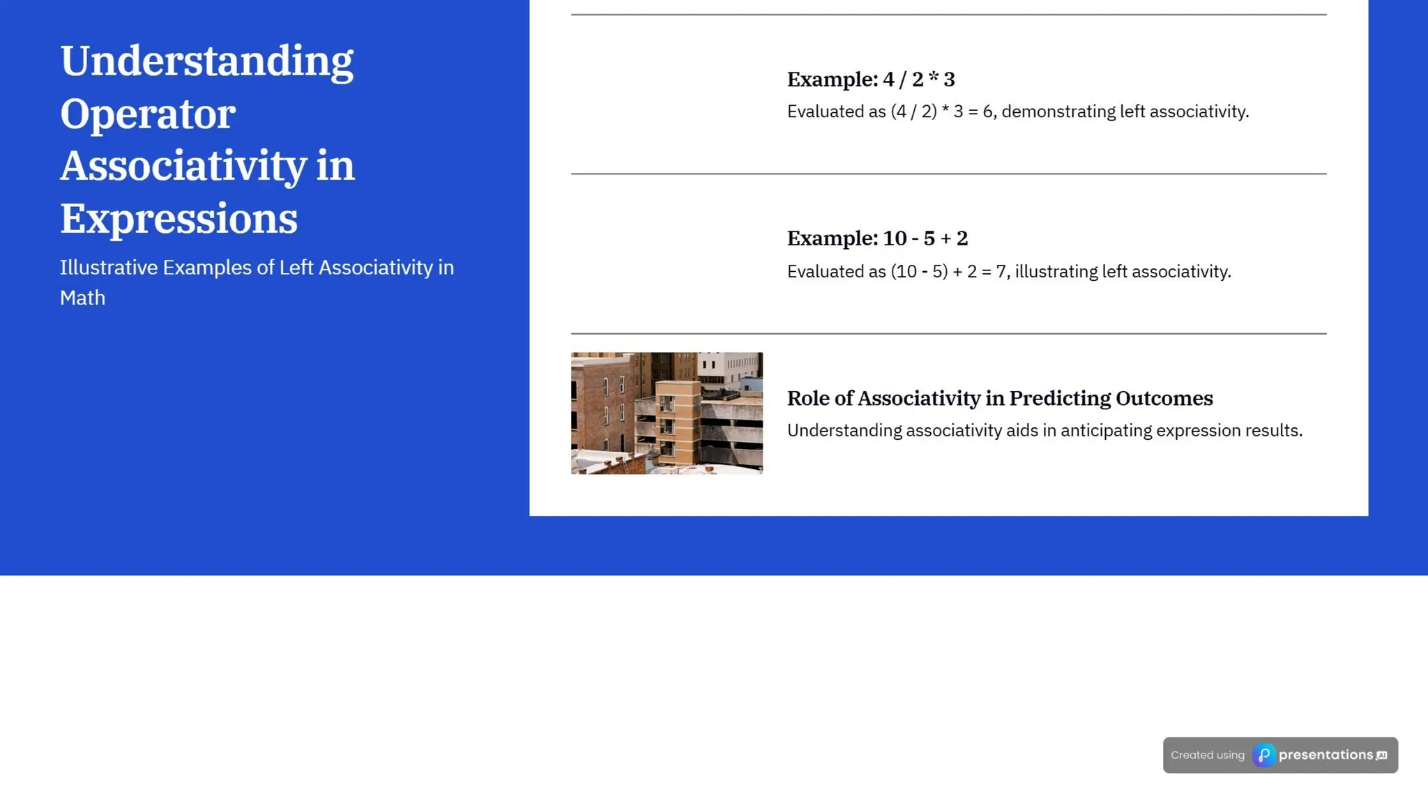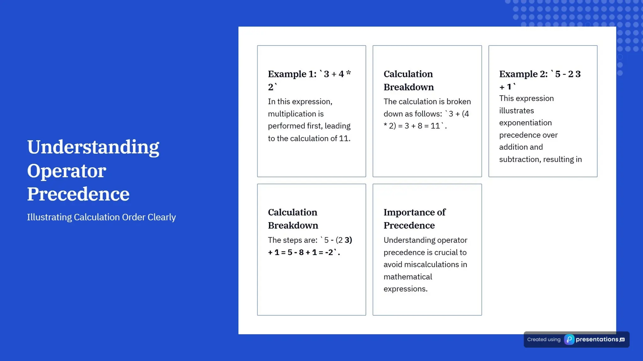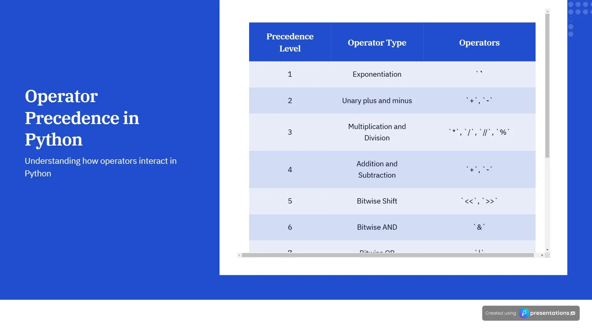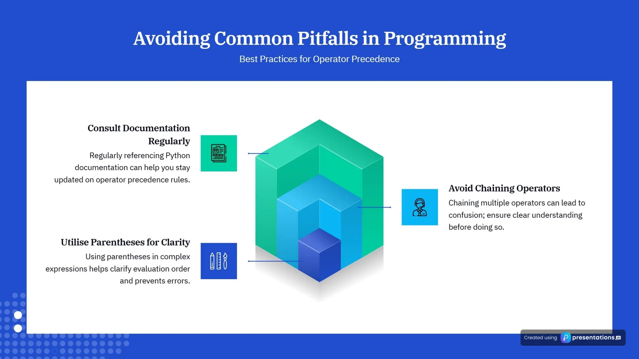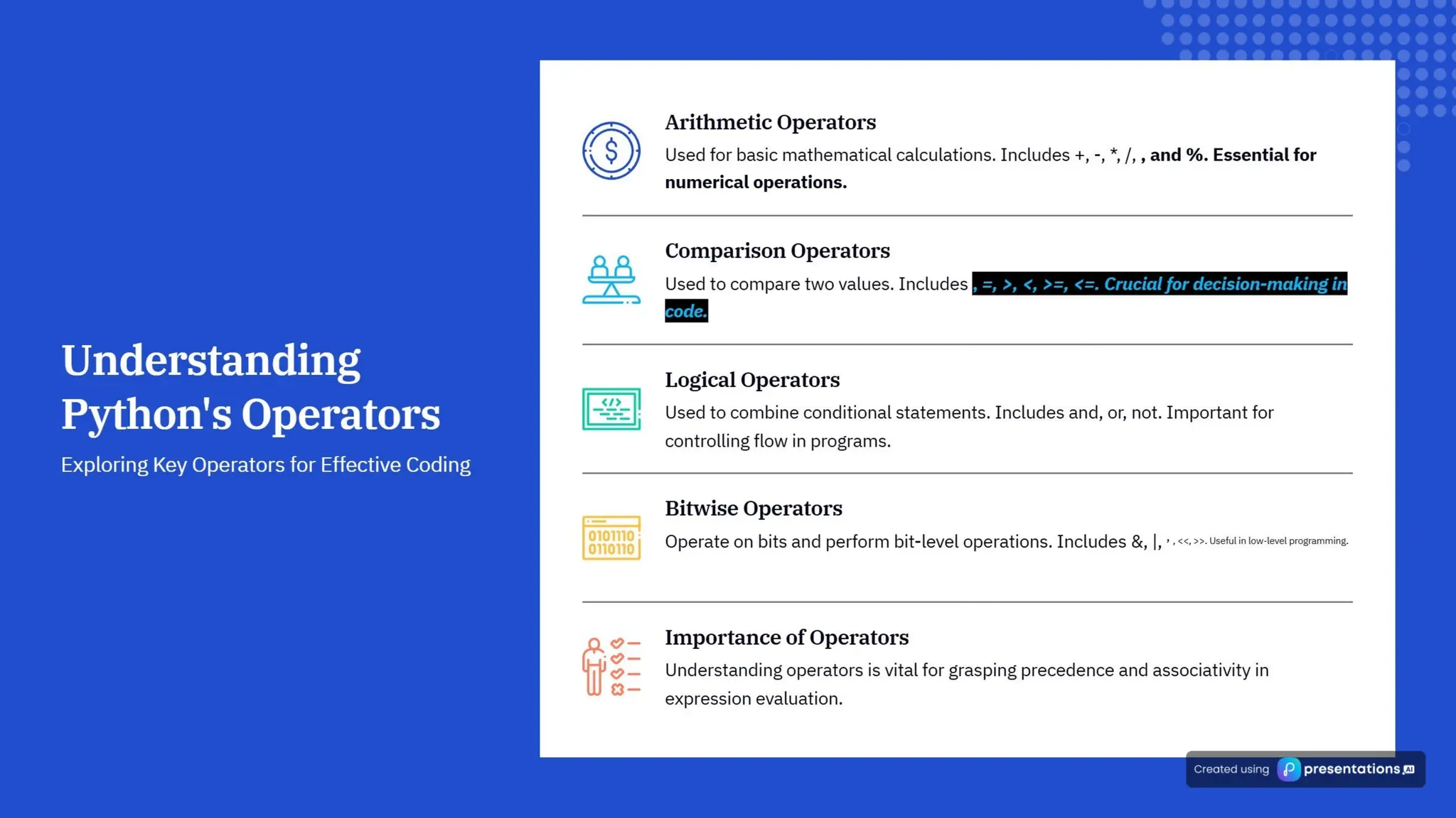 The document explains the principles of operator precedence and associativity in Python, highlighting their importance for accurate calculations and code clarity. It details how operator precedence determines the order of operations in expressions, and how associativity affects the evaluation of operators with the same precedence. Mastering these concepts is crucial for avoiding errors, improving debugging efficiency, and ensuring reliable code performance.