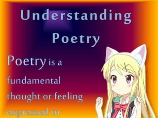 The document appears to be a collection of poetic excerpts and passages about poetry and literary devices. It includes snippets of poems discussing themes of love, beauty, and solitude. Prose sections provide definitions for terms like "elisions" and "allusions" and advise that a summary or paraphrase is no substitute for experiencing the original work.