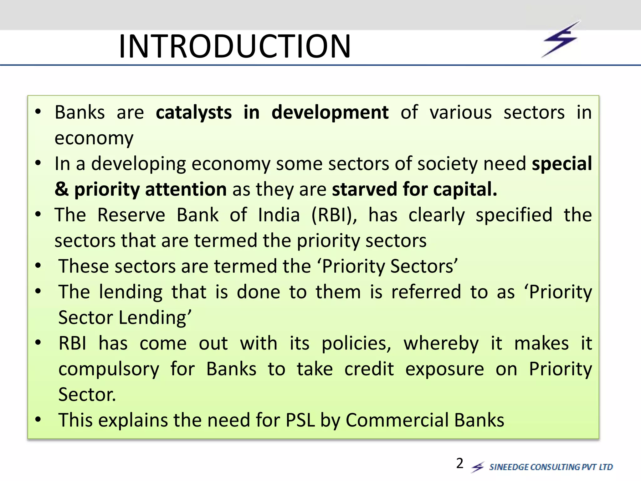 The document outlines the concept and regulations of priority sector lending (PSL) in the Indian banking industry, emphasizing its importance for the development of underfunded sectors such as agriculture and small enterprises. It details the targets set by the Reserve Bank of India (RBI) for banks to allocate a percentage of their lending to priority sectors, with specific guidelines for different types of banks. Additionally, it covers historical milestones and the evolution of PSL since its inception in 1968.