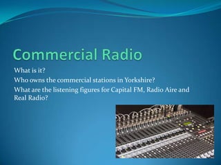 Commercial radio is funded by advertising revenue rather than public funding like the BBC. In Yorkshire, Capital FM, Radio Aire, and Real Radio are some of the major commercial stations, owned by Global Radio, Bauer Radio, and Guardian Media Group, respectively. Non-profit community radio stations also operate in Yorkshire, like PGFM in Pudsey and BCB in Bradford, which are funded through local business advertising. The radio industry workforce is concentrated in London, with around 20% in the North of England, and degrees are not always essential though new roles will require multi-skilled talents and technical/creative specialists.