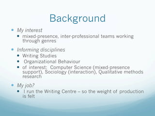 This document discusses building interdisciplinary bridges between research genres. It cautions that one must understand where they are starting from and where they want to end up before building a bridge between fields. To build the bridge, one should review the literature from both fields to understand how each writes and the interests, perspectives, methods, and styles considered acceptable. It is also important to determine how open each field is to interdisciplinary work. The document suggests that graduate writing groups across disciplines could facilitate rhetorically savvy writing that bridges fields.
