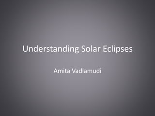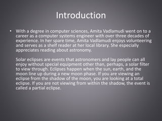 The document discusses solar eclipses and the conditions under which they occur, specifically when the sun, earth, and moon align during a new moon phase. It explains the size and distance relationship between the sun and moon, enabling the moon to obscure the sun during a total eclipse, which can be viewed with the naked eye. The document also emphasizes the need for solar filters to safely observe partial eclipses.
