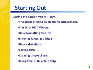 This document provides an introduction to using Excel 2007. It covers the basics of Excel including the ribbon interface, formatting cells, entering values and labels, basic calculations, sorting data, creating charts, and using online help. Excel is used to analyze, communicate, and manage information to help make informed decisions. A spreadsheet consists of a grid of cells organized into rows and columns. Formulas in Excel always begin with an equal sign and can perform calculations using addition, subtraction, multiplication, and division functions. Charts can be created by selecting a range of data and choosing a chart type.