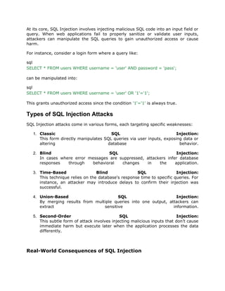 The document outlines SQL injection as a significant web security vulnerability that allows attackers to manipulate database queries, risking unauthorized access to sensitive data. It explores various types of SQL injection, their potential consequences for businesses, and provides best practices for prevention, including input validation and using parameterized queries. The piece emphasizes the ongoing relevance of SQL injection threats, especially with the rise of cloud computing and APIs, urging organizations to stay vigilant and adaptive in their cybersecurity efforts.