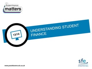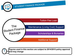 The document summarizes student financial support available in the UK for the 2014/2015 academic year. It outlines the maximum tuition fee of £9000 and availability of a non-means tested tuition fee loan. It also discusses maintenance support including a mostly non-means tested maintenance loan amount varying by location, a means tested maintenance grant, and additional support for disabled students, childcare costs, and adult dependents. Loan repayment terms are explained such as repaying 9% of income over £21,000 and any remaining balance being cleared after 30 years.