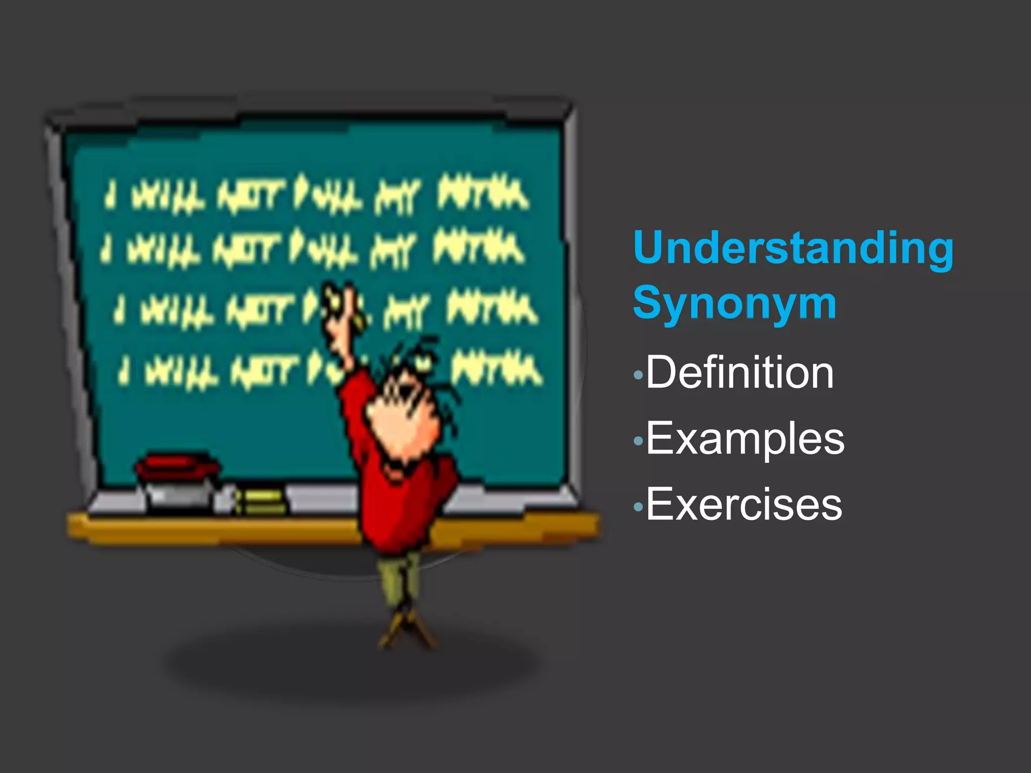 A synonym is a word that means the same or nearly the same as another word. The document provides examples of synonym word pairs and exercises for the user to choose the correct synonym from multiple choice options. It tests synonyms for various words and concepts. The document concludes by thanking the user and hoping it helped them better understand synonyms.