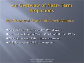 The document discusses the future of terrorism based on four theoretical waves of terrorist violence: anarchist, anti-colonial, new left, and religious. It examines terrorist environments in the 21st century which may include state-sponsored, dissident, religious, ideological, or criminal dissident terrorism. The document also explores potential future sources of terrorism in regions like the Middle East, Palestine/Israel, Latin America, Europe, Africa, and Asia as well as the threats posed by high-tech terrorism using weapons of mass destruction or cyberterrorism.