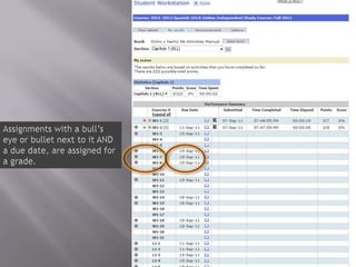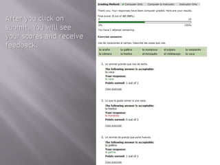 The document provides instructions for using the Quia online learning platform. It explains how to log in, access assignments, view grades and complete exercises. Students are advised to study materials first before attempting practice activities and homework assignments in order to be successful. Assignments are submitted through clicking the "Submit" button once an attempt has been made to fully complete the work.