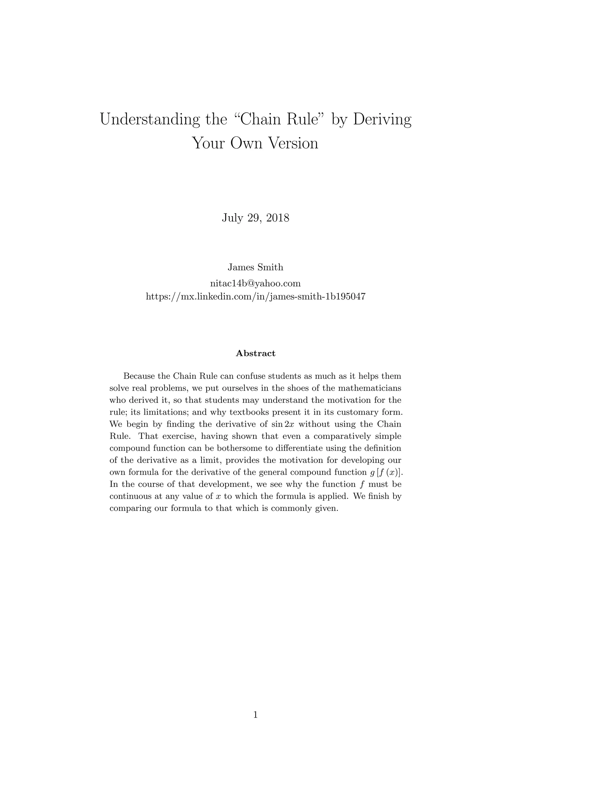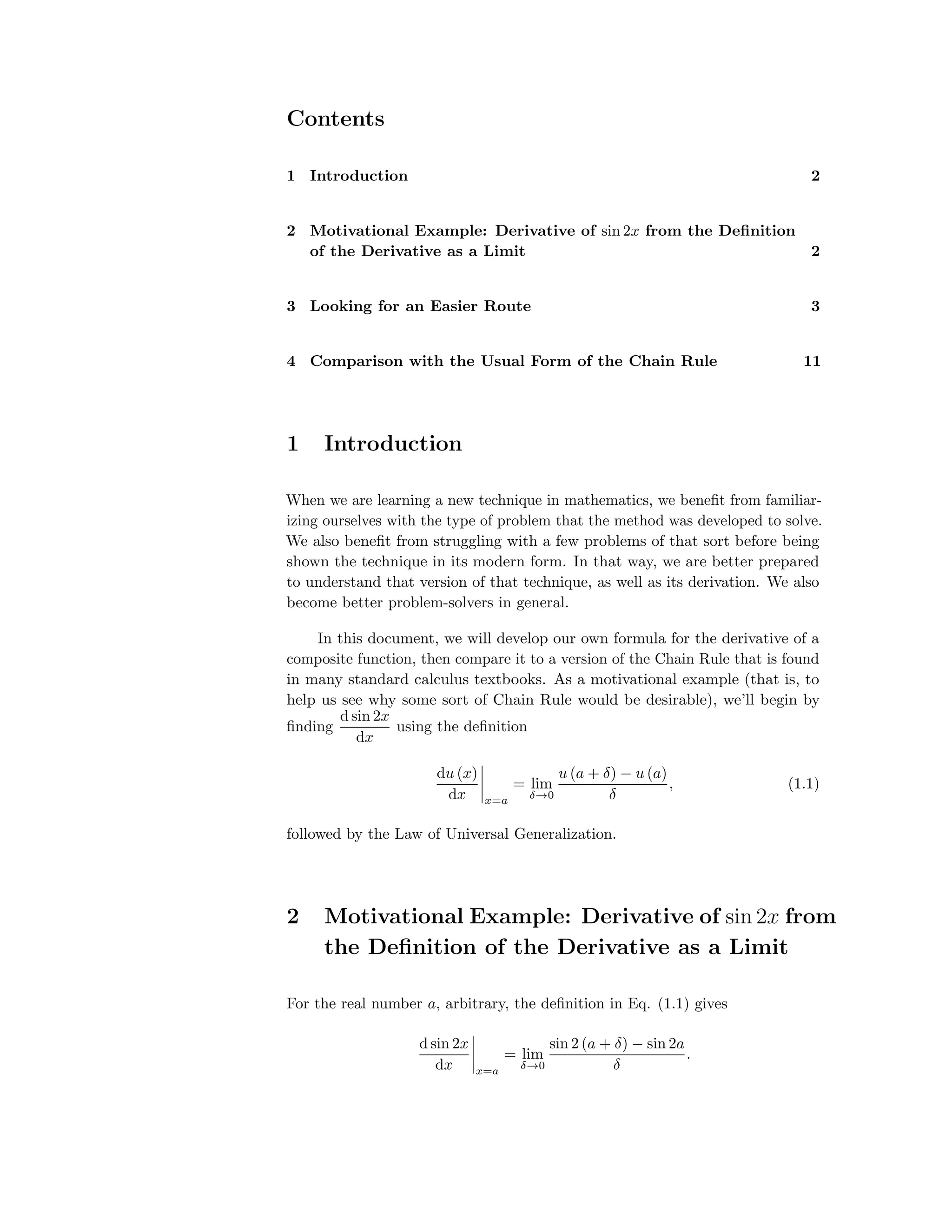 The document discusses the chain rule in calculus, emphasizing the importance of understanding its derivation from a motivational example involving the derivative of sin 2x without using the chain rule. It outlines the process of deriving a formula for the derivative of a composite function and highlights the necessity for continuity in the function f for applying the derived formula. The author compares the newly developed formula to the traditional chain rule commonly found in calculus textbooks.