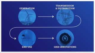 Electricity is generated at power plants through various methods like fossil fuels, wind, solar, water, and nuclear energy. It is then sent through high voltage transmission lines to substations where the voltage is reduced before being distributed through wires on utility poles to homes and businesses. Advanced technologies are improving the grid through microgrids, energy storage, smart meters, and digital platforms that allow for better monitoring, analytics, and innovative consumer services.