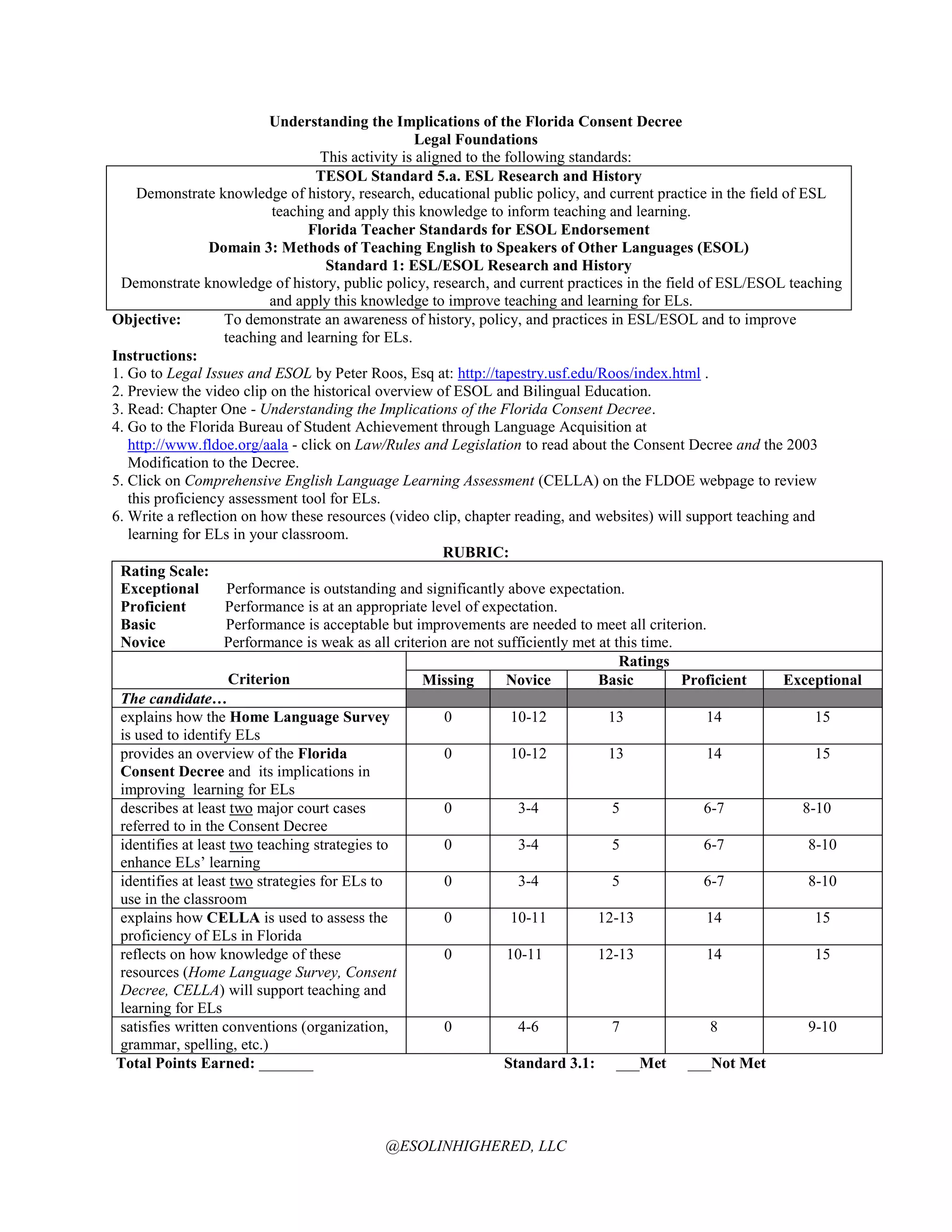 This document provides instructions for an activity to demonstrate understanding of the implications of the Florida Consent Decree for teaching English learners. Participants are asked to review resources on the history of ESOL education, the Florida Consent Decree establishing requirements for ESOL programs, and the CELLA English proficiency assessment. They then must write a reflection on how increased knowledge of these topics from the provided resources can support teaching and learning for English learners. Their response will be evaluated based on criteria such as explaining how specific policies and assessments are used and how awareness of this information can enhance instruction for English learners.