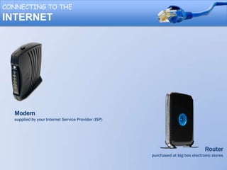 This document provides information about connecting to the internet through a modem supplied by an internet service provider, a router purchased separately, and wireless hotspots. It also lists the Nashville Public Library's address and operating hours for public computer and WiFi access without needing a library card. Finally, it gives examples of web browsers like Google Chrome, Internet Explorer, and Firefox and instructions for browsing websites by typing addresses or searching online through search engines.