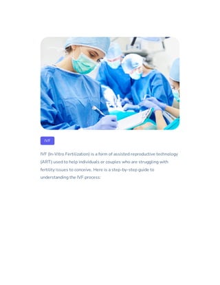The document provides a step-by-step guide to the in-vitro fertilization (IVF) process, outlining key stages including initial consultation, ovarian stimulation, egg retrieval, fertilization, embryo culture, and embryo transfer. It emphasizes the importance of monitoring and testing throughout the process, which can be both physically and emotionally demanding. Ultimately, IVF aims to help individuals or couples struggling with fertility achieve their goal of conceiving a child.