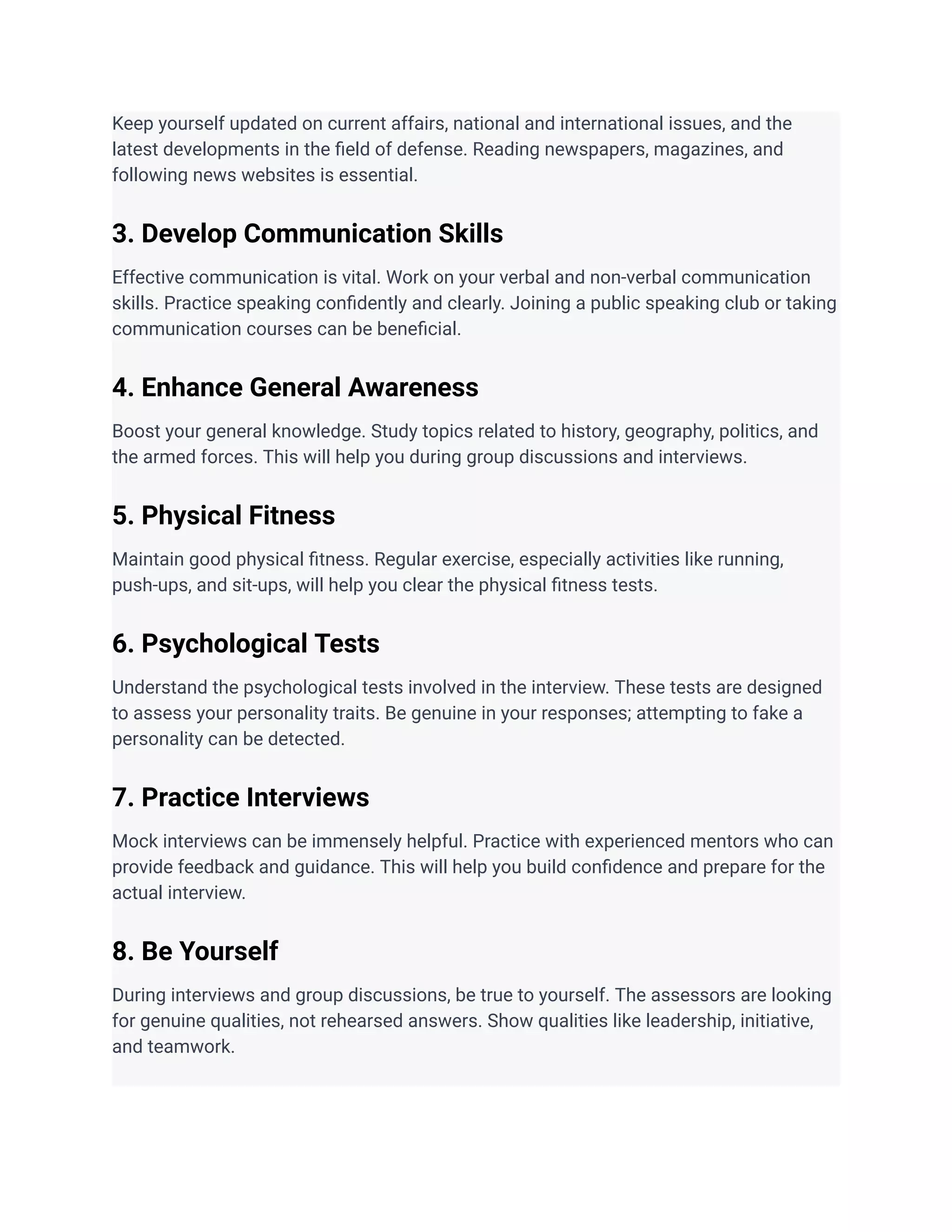 The document outlines essential preparation strategies for the NDA SSB interview, emphasizing the importance of understanding the interview process, enhancing communication skills, maintaining physical fitness, and being genuine. It also highlights the role of NDA coaching institutes in Lucknow, which offer specialized guidance, comprehensive study materials, mock tests, and personalized attention to help aspirants succeed. Ultimately, the right preparation, determination, and support can significantly improve candidates' chances of becoming NDA officers.