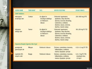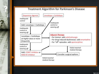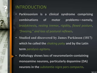 Parkinson's disease is a progressive neurological disorder caused by the loss of dopamine-producing neurons in the substantia nigra. The motor symptoms include tremors, rigidity, bradykinesia, and postural instability. Levodopa is the most effective drug for treating motor symptoms but causes adverse effects like involuntary movements. Other drugs used include dopamine agonists, COMT inhibitors, anticholinergics, and MAO-B inhibitors. Surgical therapies like deep brain stimulation may provide relief for advanced cases. The pathogenesis involves mitochondrial dysfunction, oxidative stress, and protein aggregation.