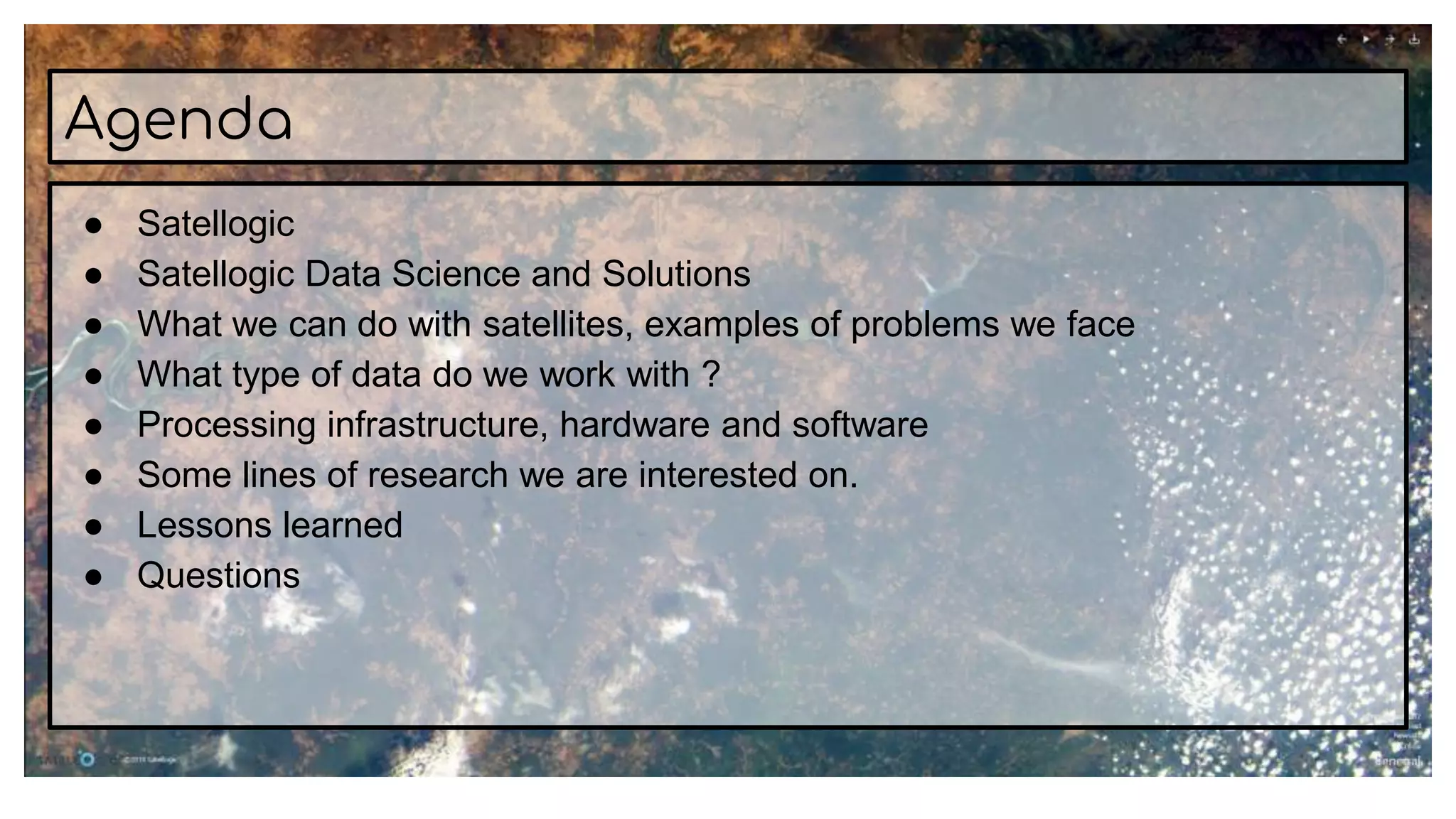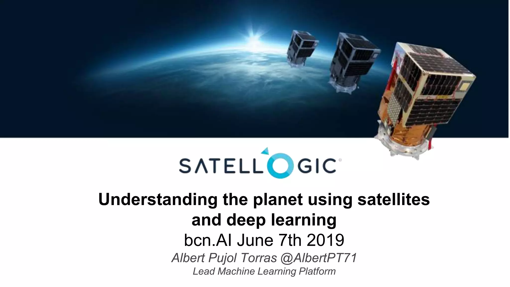 The document discusses the use of satellites and deep learning for understanding and monitoring various problems related to the planet, highlighting the importance of data sources, processing infrastructure, and machine learning applications. It outlines challenges faced in data collection and ground truth annotation and emphasizes the need for robust algorithms and a deep understanding of client requirements. Additionally, the document presents lines of research, lessons learned, and the significance of scalable infrastructure for effective solution development.