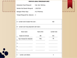 The document outlines the polling process for elections, detailing the roles and responsibilities of polling agents and counting agents (paca) to ensure fair voting practices. It includes information on voter verification, the actual voting procedures, and how to handle ballot papers during counting, emphasizing the importance of being alert to any irregularities. Additionally, it specifies the equipment and documentation required for pacas, as well as guidelines for maintaining order and integrity during the election process.