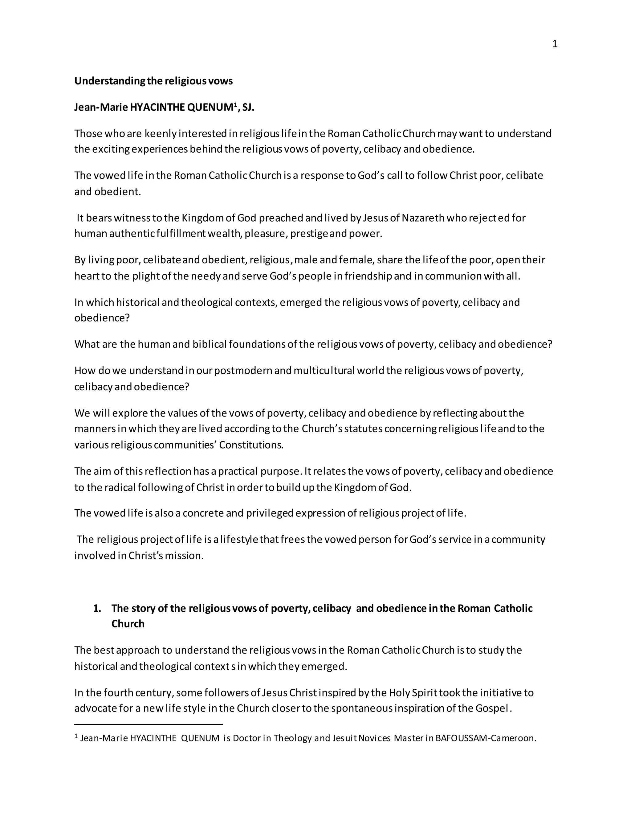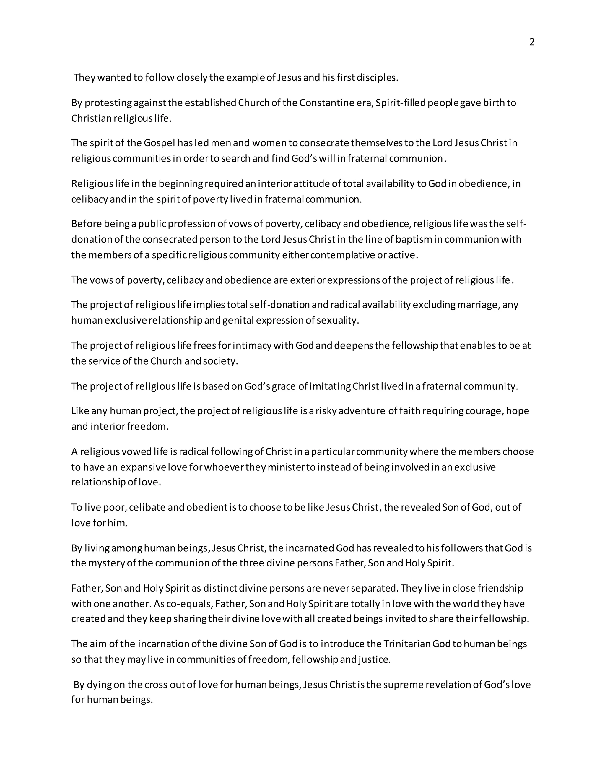 The religious vows of poverty, celibacy and obedience emerged in the 4th century when some followers of Jesus Christ, inspired by the Holy Spirit, advocated for a new lifestyle in the Church that was closer to the spontaneous inspiration of the Gospel. They wanted to follow the example of Jesus and his first disciples more closely. These vows are outward expressions of the religious life project, which involves total self-donation and radical availability, excluding marriage and exclusive relationships. Living these vows is meant to free people for intimacy with God and enable them to serve the Church and society. The human and biblical foundations of vowed life include Jesus living simply, celibately and obediently, inspiring religious communities to live radically as he