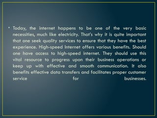 High-speed internet is essential for modern businesses, providing benefits such as improved productivity, effective communication, and enhanced customer service. It supports the use of cloud applications, quick data transfers, and innovation, ultimately allowing companies to adapt and thrive in a competitive market. Access to quality internet services significantly enhances overall user experience and operational efficiency.