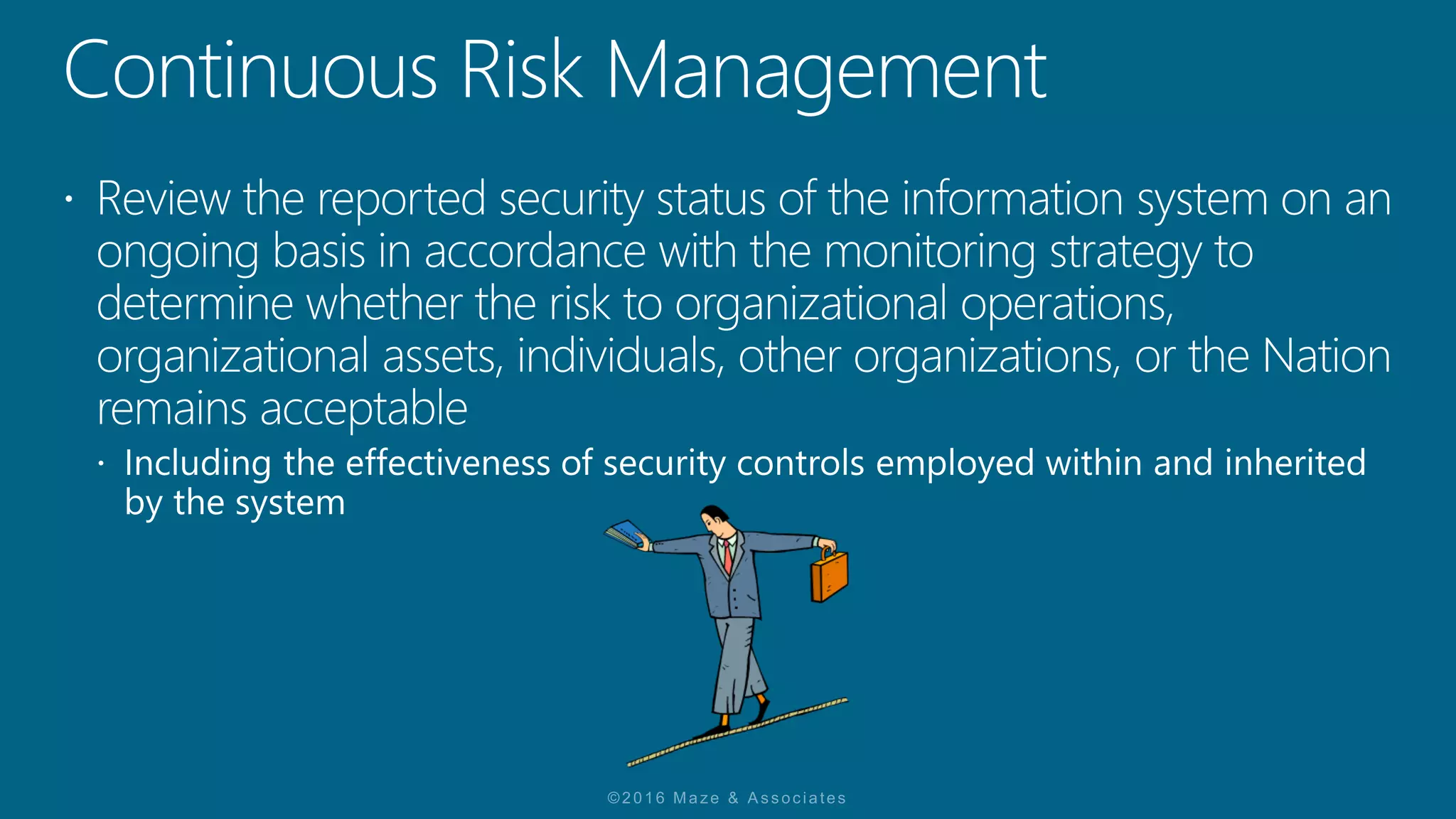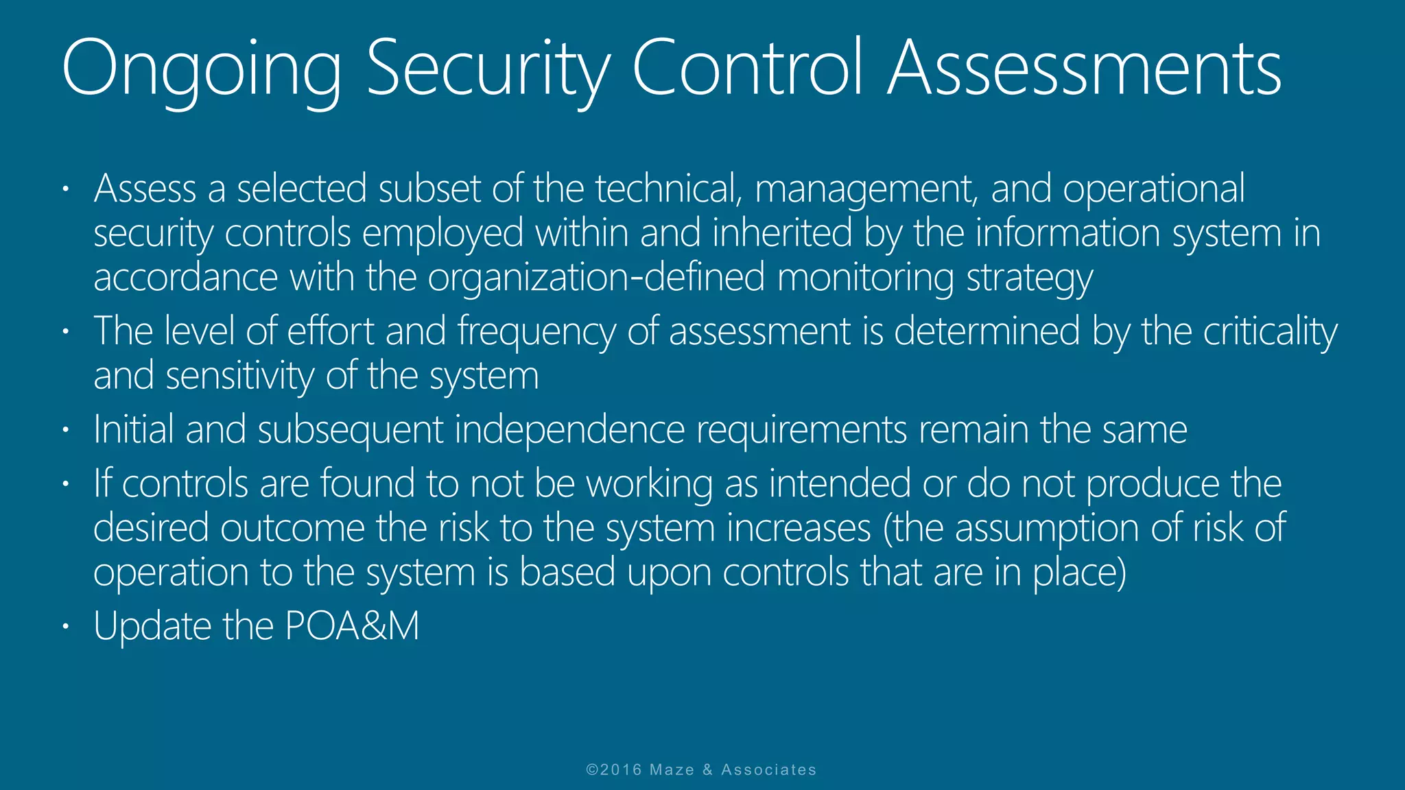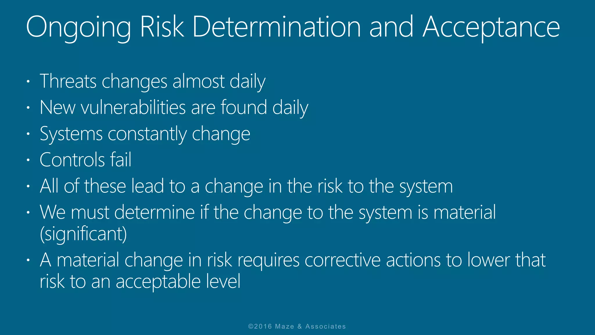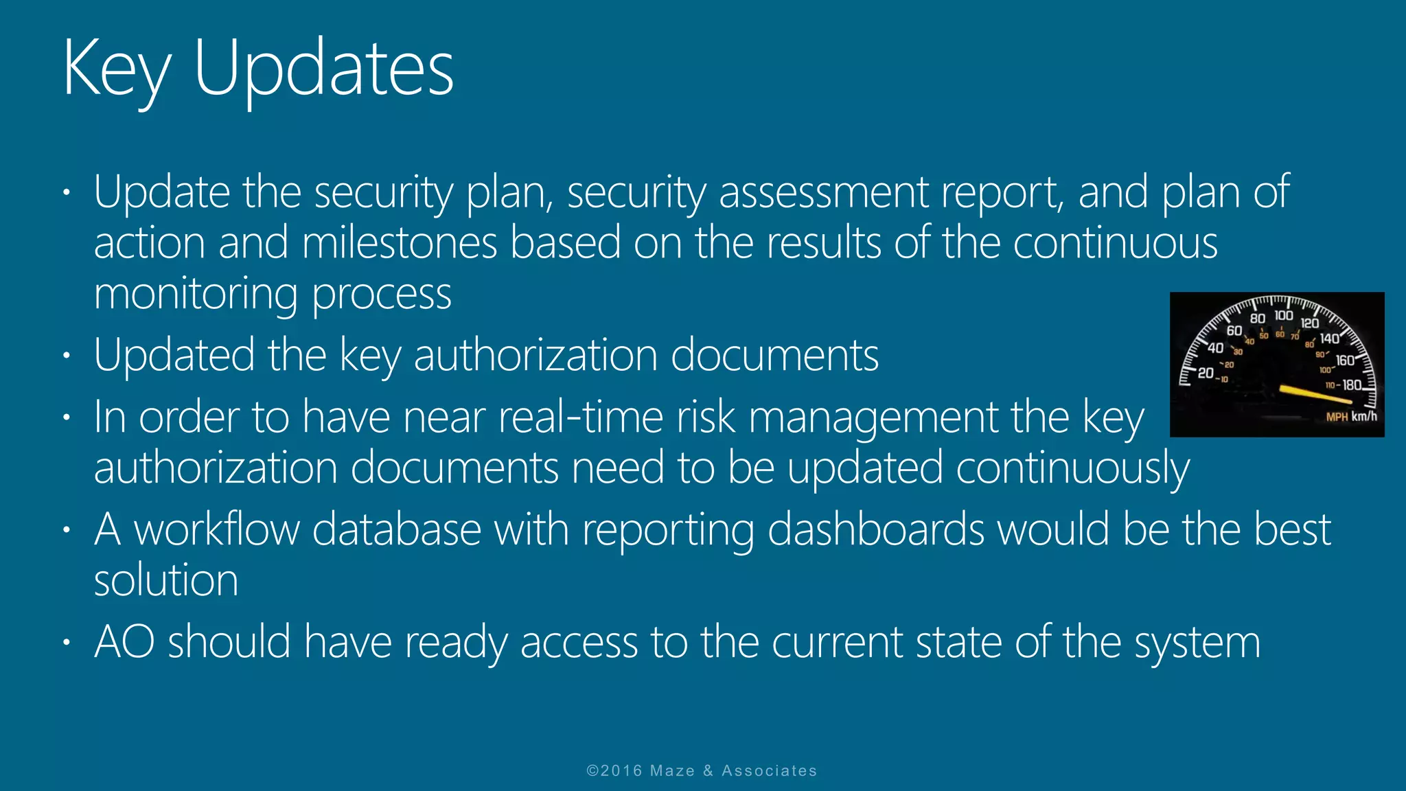 The document discusses the Risk Management Framework (RMF) process for authorizing information systems and maintaining ongoing security authorization. It outlines the six steps of the RMF process - Categorize, Select, Implement, Assess, Authorize, Monitor. The ultimate goal is to achieve ongoing authorization where the authorizing official has sufficient knowledge of the system's security state to determine if continued operation is acceptable based on ongoing risk assessments. Any changes to the system may change the risk, and the RMF process includes tasks for evaluating changes and their impact on risk.