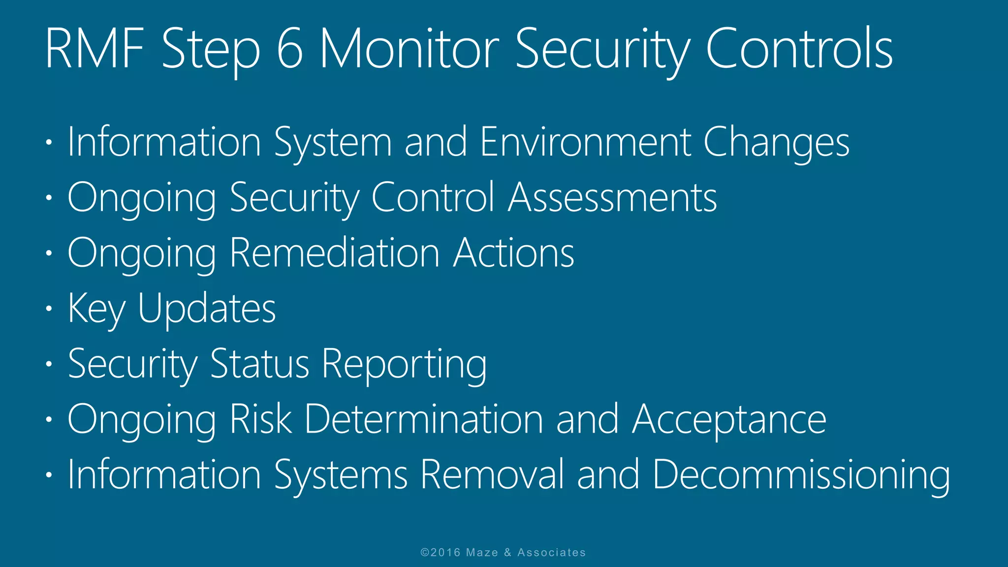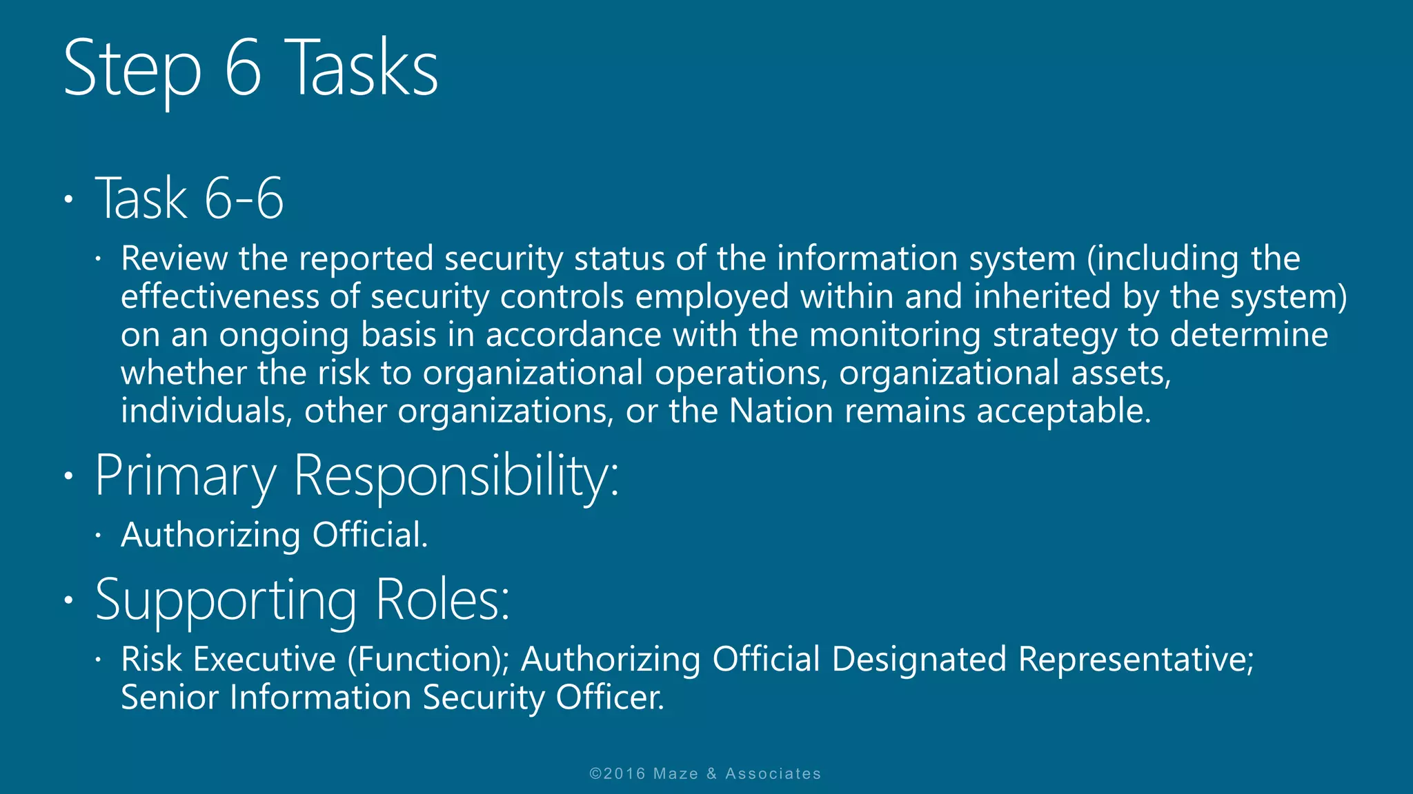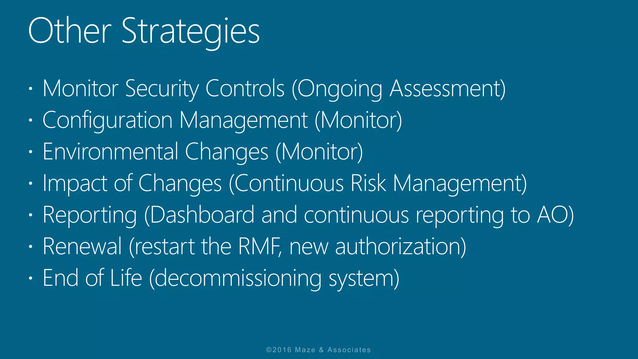 The document discusses the Risk Management Framework (RMF) process for authorizing information systems and maintaining ongoing security authorization. It outlines the six steps of the RMF process - Categorize, Select, Implement, Assess, Authorize, Monitor. The ultimate goal is to achieve ongoing authorization where the authorizing official has sufficient knowledge of the system's security state to determine if continued operation is acceptable based on ongoing risk assessments. Any changes to the system may change the risk, and the RMF process includes tasks for evaluating changes and their impact on risk.