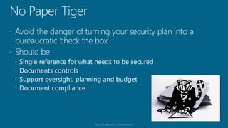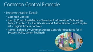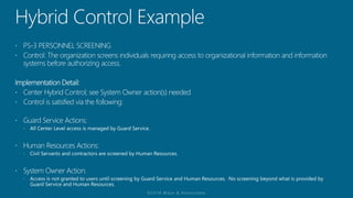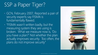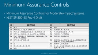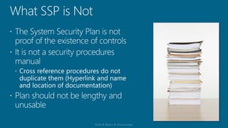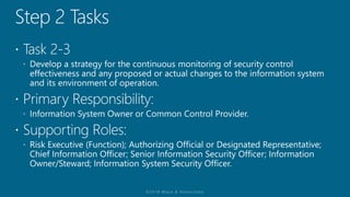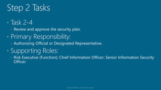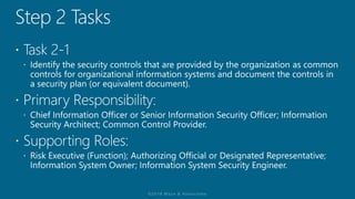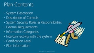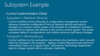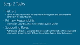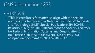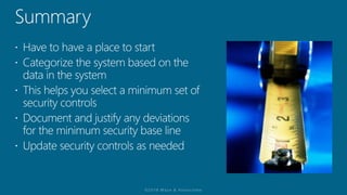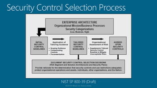 The document outlines the categorization, implementation, and assessment of security controls for information systems according to NIST standards, particularly NIST SP 800-53 and SP 800-37. It emphasizes the importance of selecting appropriate controls based on data sensitivity and provides guidance on developing an information system security plan. The document also discusses the concept of compensating security controls for risk management in various security baselines.